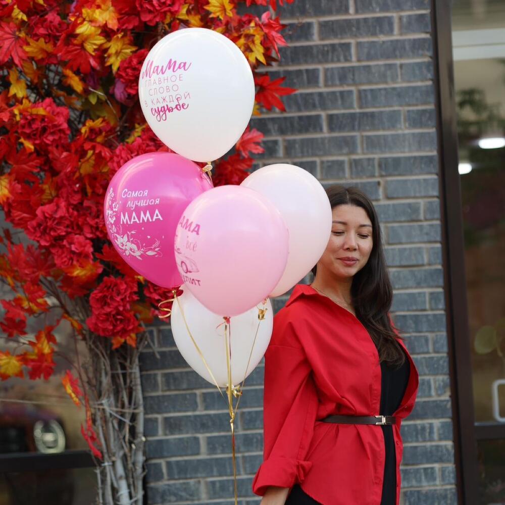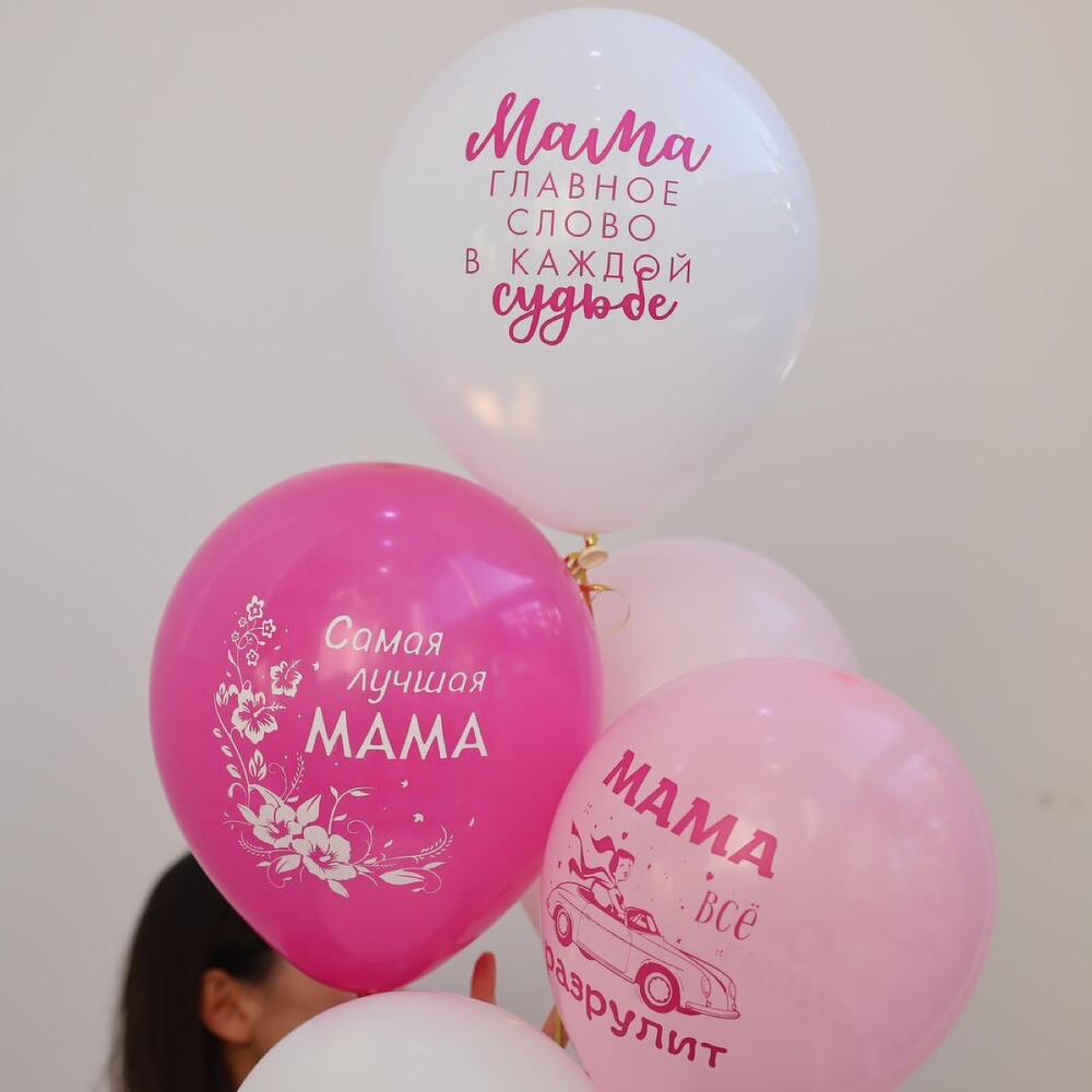 Шары, наполненные гелием, отличное дополнение к подарку для самых лучших мам. Три шара с тематическими надписями и два однотонных