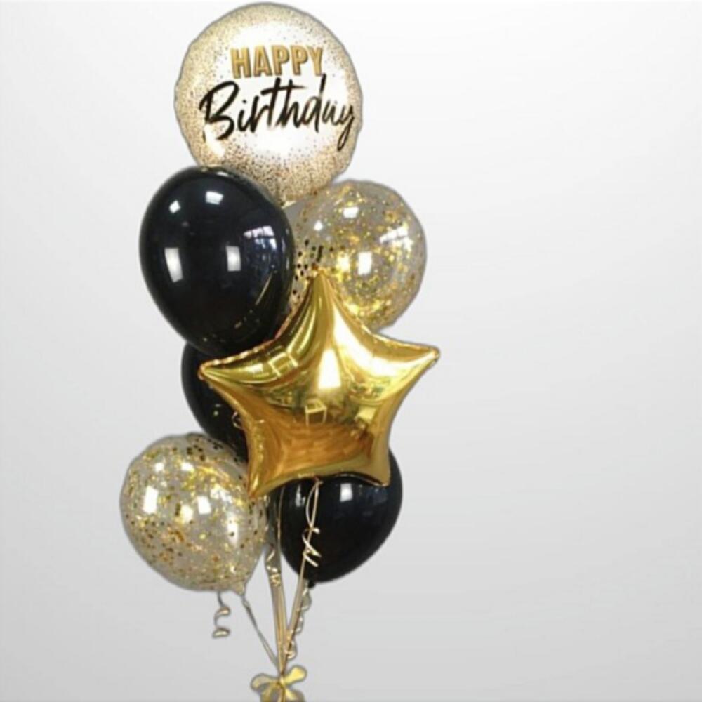 Фонтан шаров с гелием в составе: Фольгированный шар С днём рождения или Happy birthday, Фольгированный шар звезда цвет по выбору. 5 шаров латекс пастель цвет по выбору 2 шара латекс прозрачный с конфетти Грузик