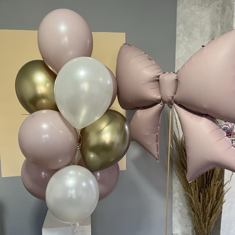 В наборе 10 Шаров латекс, надутых гелием . 1 шар фольга Бант . ( летают )