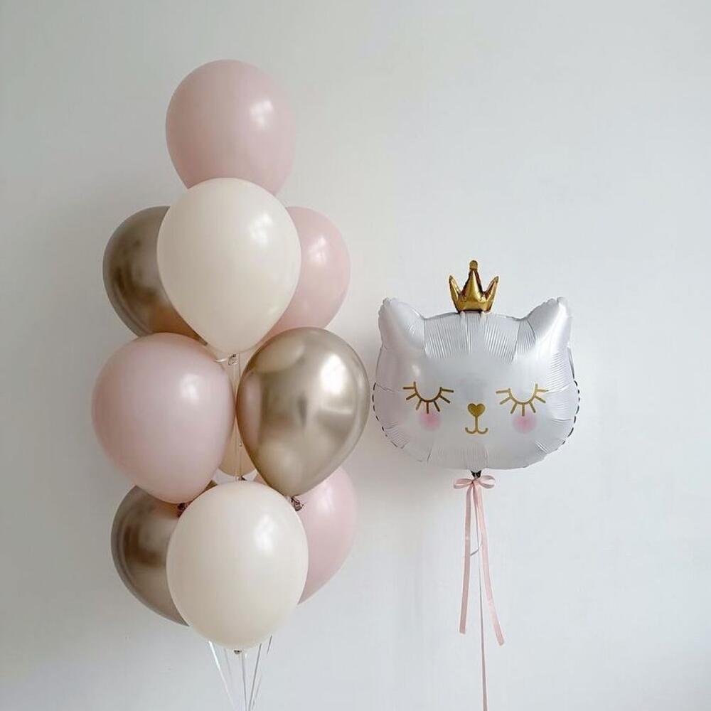 Фонтан из 10 Шаров 4 шара розовых 30 см 3 шары белый песок 30 см 3 шара хром «Шампань»30 см Кошечка белая с короной 66 см