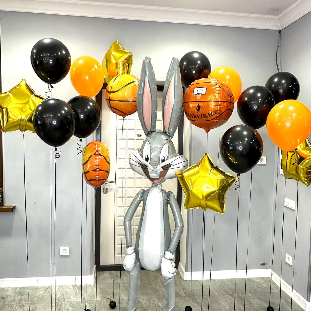 Ходячая ростовая фигура Багз Банни (2 метра) 10 шаров (5 оранжевых,5 черных) 4 звезды золото 3 баскетбольных мяча