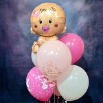 Фонтан на выписку состоящий из 6 латексных тематических шаров и фольгированной фигуры пупсика. Подобный фонтан может быть собран как для девочки, так и для мальчика, с соответствующими изменениями в цвете. Фонтан крепится к грузику и упаковывается в транспортировочный пакет.