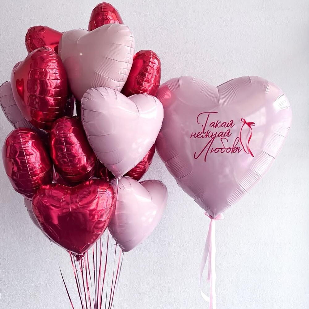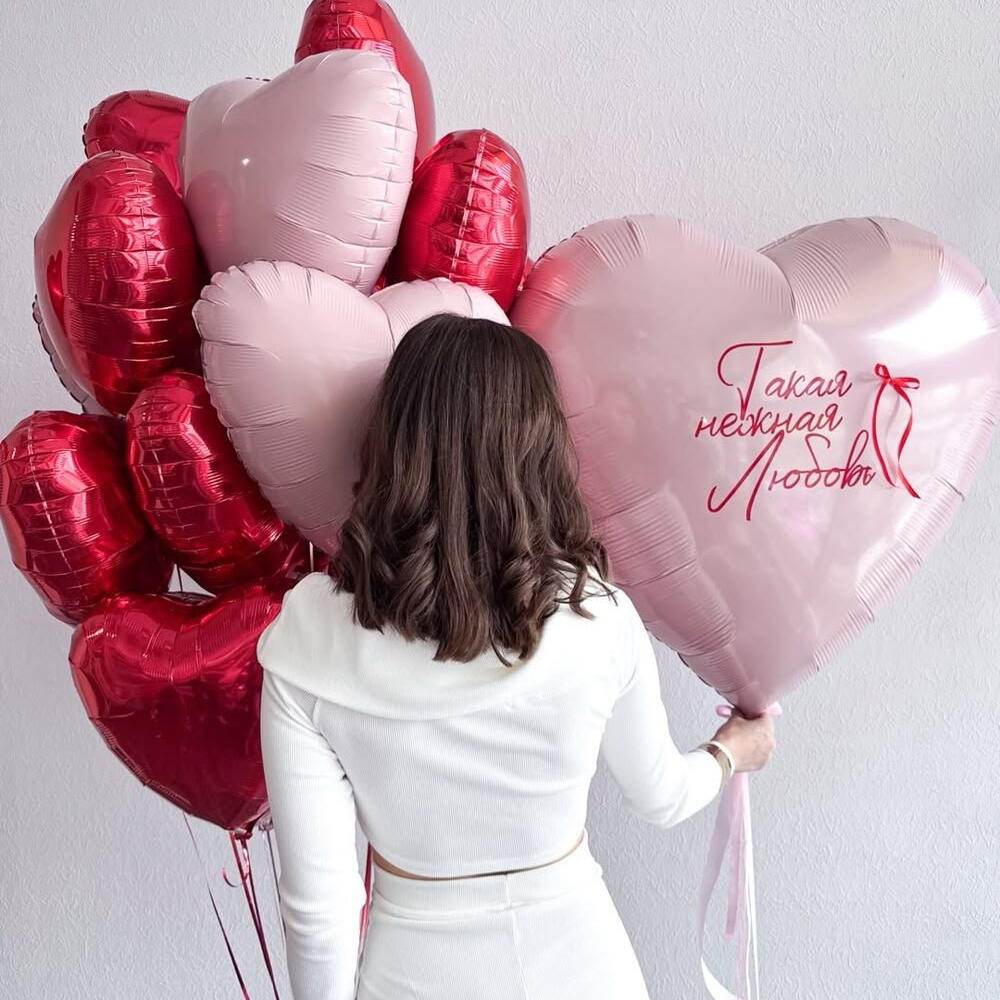 Сет из 18 воздушных шаров «Такая нежная любовь» Подарите искренние эмоции с помощью роскошного набора фольгированных сердец! Этот стильный фонтан станет идеальным подарком на День святого Валентина, годовщину, выписку из роддома или просто как признание в чувствах, которое скажет больше любых слов. Что входит в набор: • 17 фольгированных сердец (18 дюймов / 45 см): Гармоничное сочетание классического красного глянца и нежно-розовой пастели. Большая связка создает эффект «облака» и выглядит очень объемно. • 1 гигантское сердце (30 дюймов / 76 см): Главный акцент композиции с изящной каллиграфической надписью «Такая нежная любовь». Почему этот набор — отличный выбор? 1. Долговечность: Фольгированные шары держат форму и летают значительно дольше обычных латексных (от нескольких дней до пары недель). 2. Фотогеничность: Идеальный вариант для праздничных фотосессий и оформления интерьера. Благородный блеск фольги отлично смотрится при любом освещении. 3. Вау-эффект: Сочетание почти двух десятков сердец разного размера создает ощущение настоящего праздника и роскоши.