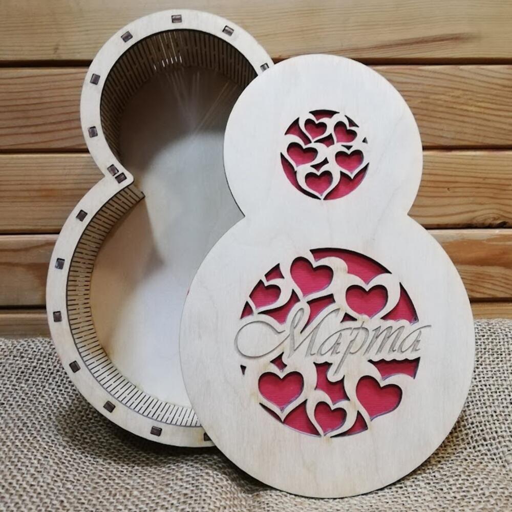 Шкатулка Восьмерка из березовой фанеры – это оригинальный и стильный подарок к Международному женскому дню. Выполненная в форме цифры 8, она символизирует праздник и становится не просто упаковкой, а частью подарка. Изготовленная из экологичной березовой фанеры, шкатулка обладает прочностью и долговечностью. Натуральный цвет и текстура дерева придают ей особый шарм и делают ее универсальной для любого стиля оформления. Внутри шкатулки Восьмерка можно разместить разнообразные подарки: цветы, конфеты, косметику, украшения или другие приятные мелочи. Она станет прекрасным дополнением к основному подарку и будет напоминать о празднике еще долгое время. Шкатулка Восьмерка – это не только оригинальный, но и практичный подарок. После праздника ее можно использовать для хранения украшений, косметики или других мелочей, сохраняя приятные воспоминания о 8 марта. Размер (Ш * Г * В): 20 * 13 * 6 см