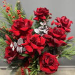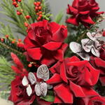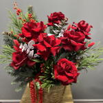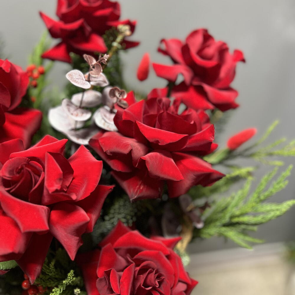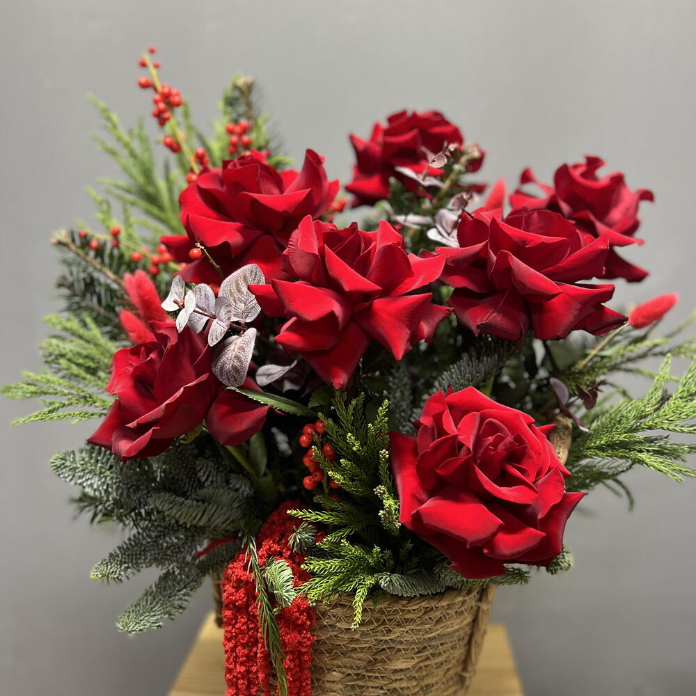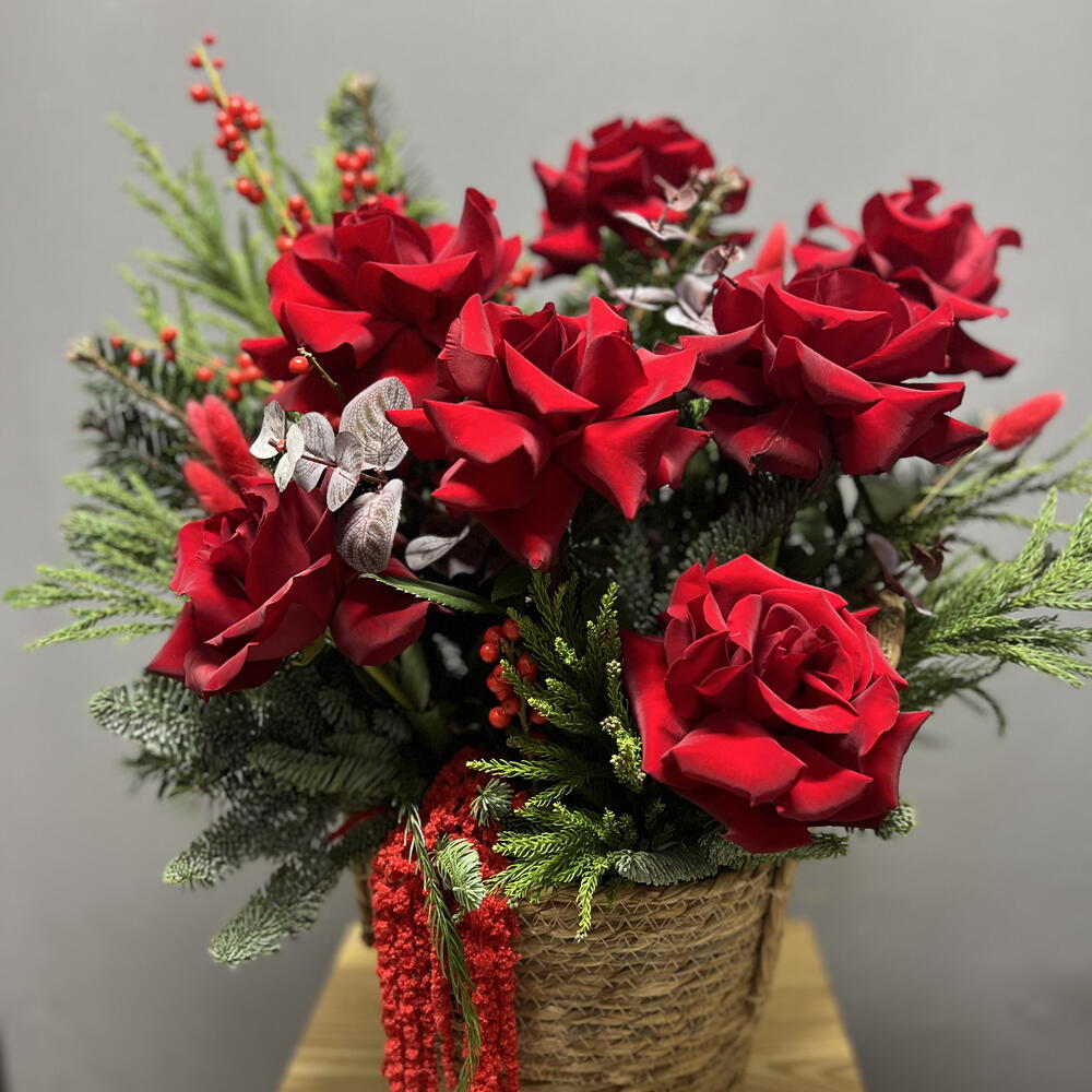 Эвкалипт - 2 шт. Туя - 3 шт. Илекс Красный - 1 шт. амарант стабилизированный - 1 шт. нобилиса (ветка) - 2 шт. роза французская красная - 7 шт. лукошко плетеное с оазисом - 1 шт.
