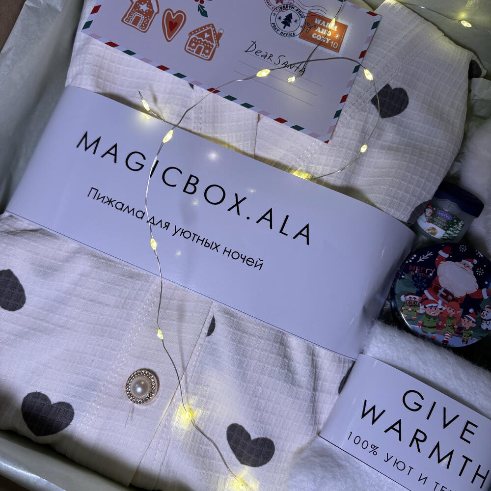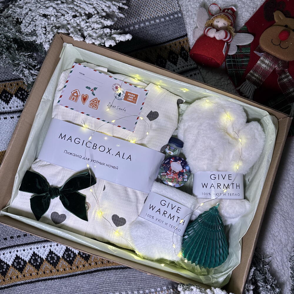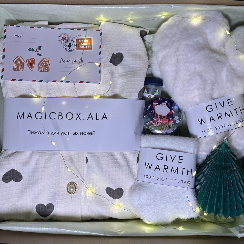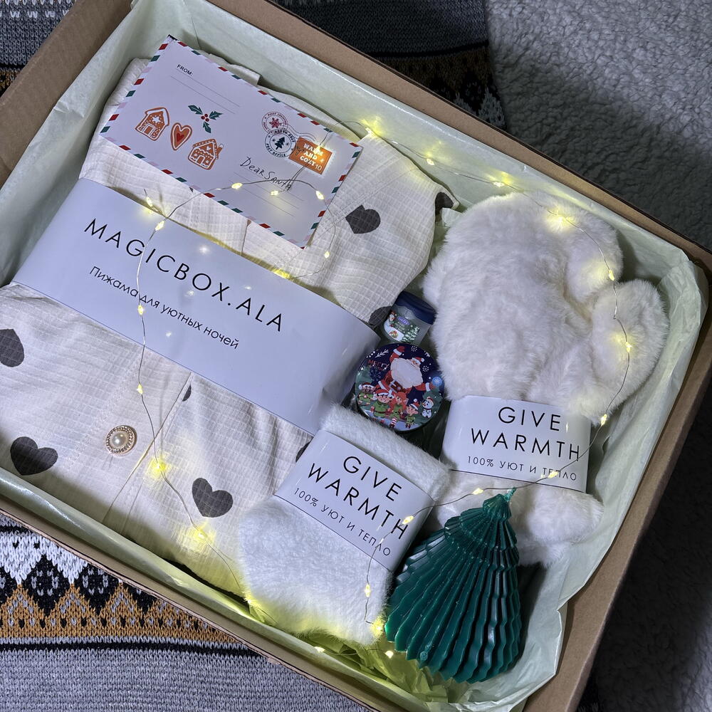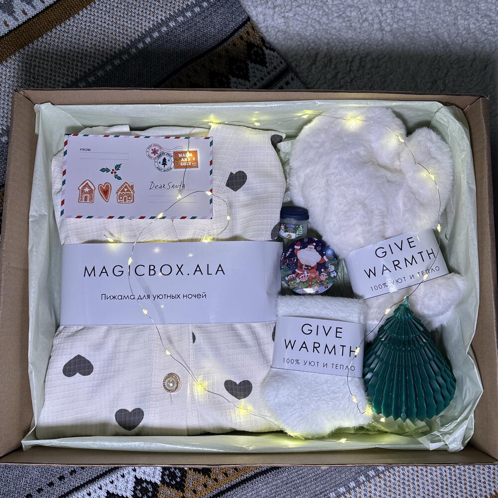 Подарите себе или близким атмосферу волшебства и заботы с нашим праздничным набором. В каждом элементе — нежность, комфорт и новогоднее настроение. 🎁 Внутри бокса: • Пижама вафельная (размер L) — мягкая и воздушная, создаёт ощущение полного уюта. • Мягкие носочки — согреют в зимние вечера и подарят комфорт при каждом шаге. • Ароматная свеча в форме ёлочки — наполняет дом праздничным настроением. • Свеча с крышкой — стильный аксессуар для создания тёплой, расслабляющей атмосферы. • Бальзам для губ — бережный уход и защита в холодное время года. • Белые варежки — нежные и тёплые, станут идеальным зимним аксессуаром.