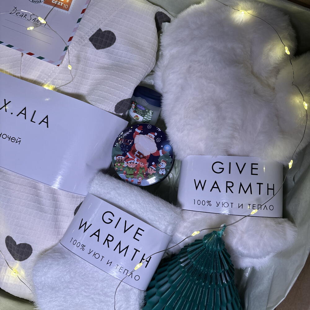Носочки - 1 шт. открытка с вашими пожеланиями - 1 шт. свеча елка - 1 шт. свеча с крышкой - 1 шт. бальзам для губ sadoer 7 гр - 1 шт. пижама вафельная размер l - 1 шт. варежки теплые белые - 1 шт.