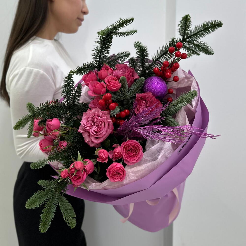 Праздничный букет, созданный в лучших традициях зимнего флористического искусства. Цветы, хвоя и декоративные детали гармонично сочетаются, создавая уют, тепло и новогоднее настроение