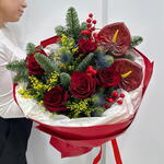 Теплый зимний букет, в котором классические цветы сочетаются с хвойными веточками. Он пахнет уютом, мандаринами и ожиданием чуда — идеальный вариант для подарка или праздничного декора