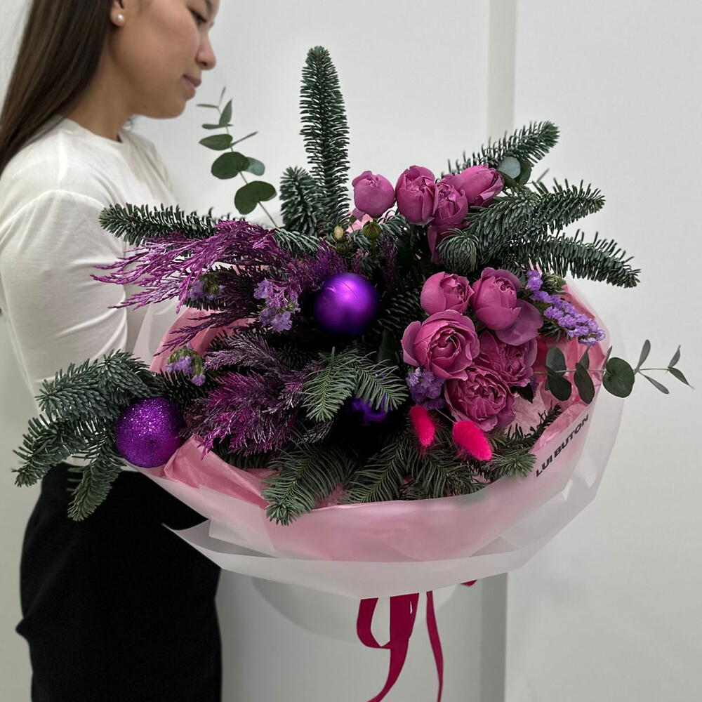 Букет, будто сошедший с зимней открытки: благородная зелень, яркие акценты и легкий аромат хвои. Создает праздничную атмосферу даже тогда, когда за окном еще не выпал снег
