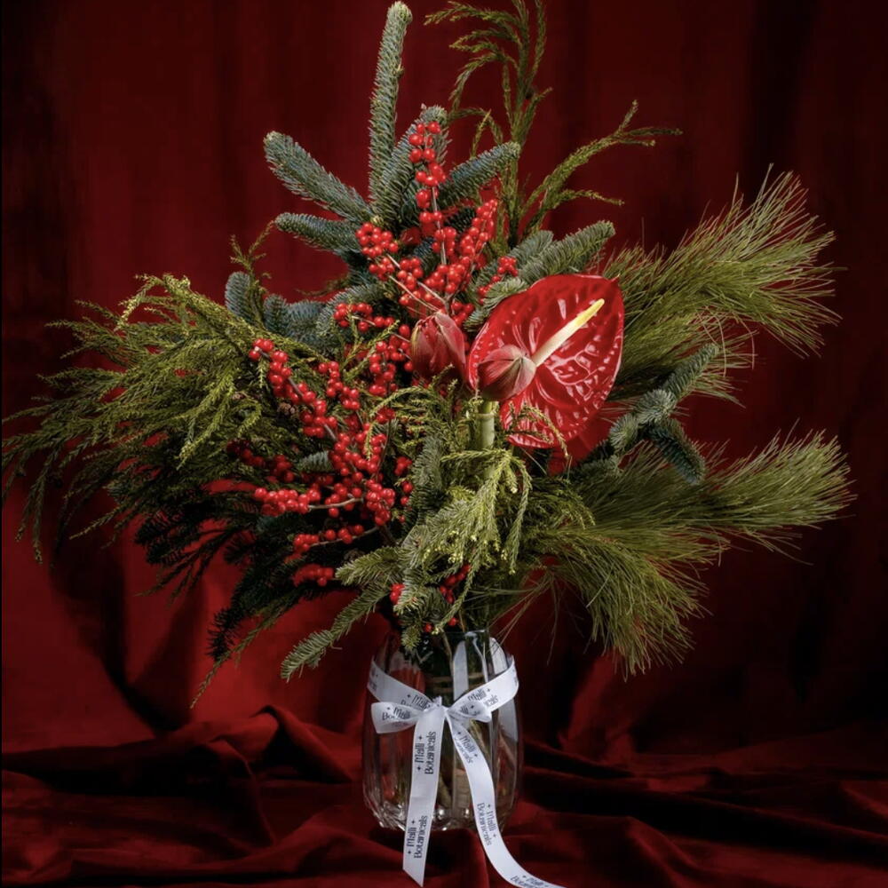 Композиция, в которой рубиновая глубина алых цветов встречается с ароматной хвоей. Контраст насыщенности и природной свежести создаёт уверенный, благородный образ. Букет словно перенесён из зимнего леса высокой моды — выразительный, роскошный и идеально собранный.