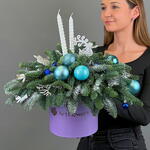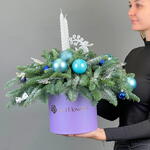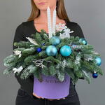Элегантная композиция из нобилиса с крупными голубыми шарами, белыми свечами и морозным декором. Выдержана в холодной сказочной палитре, подчёркнута дизайнерской коробкой в лавандовом тоне.