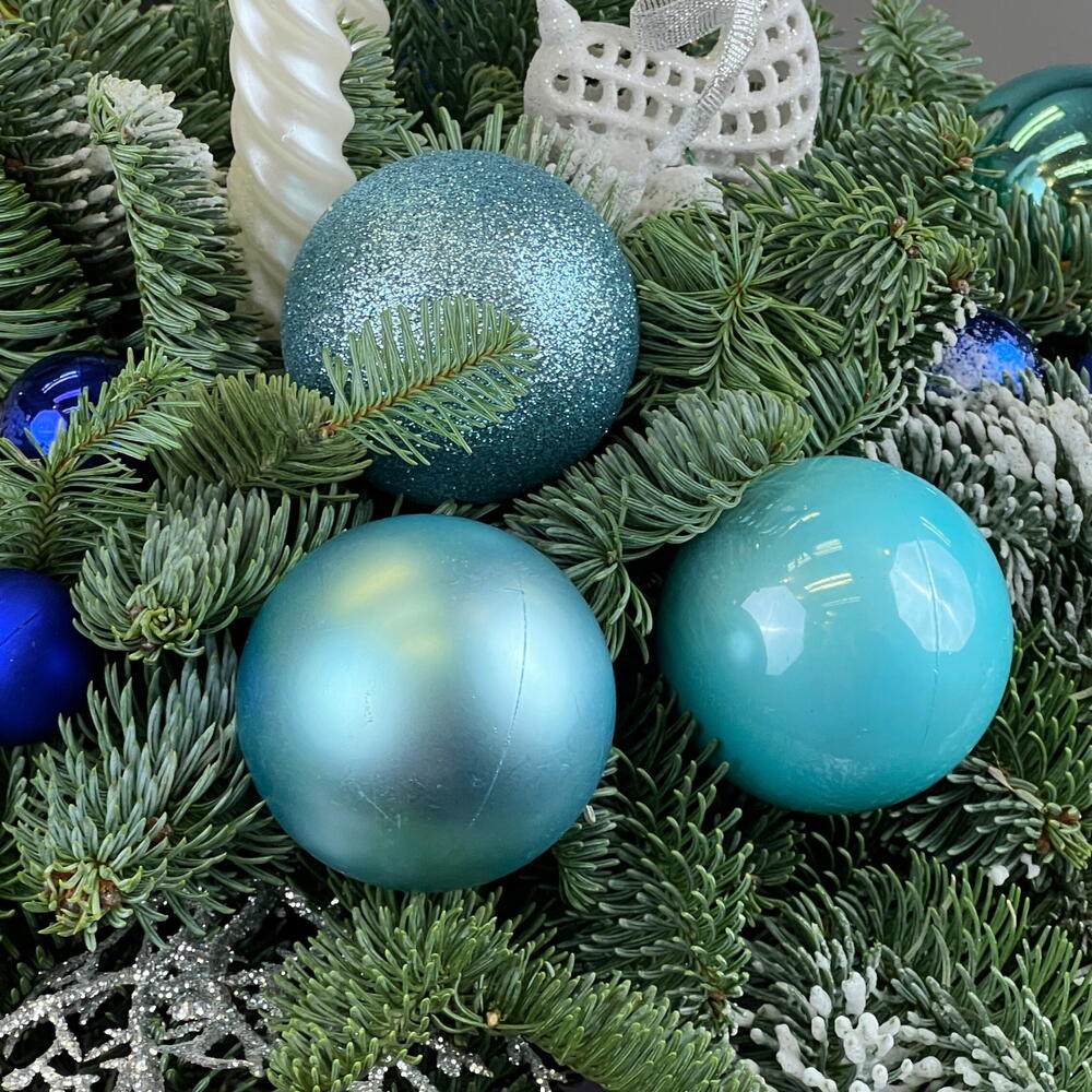 Элегантная композиция из нобилиса с крупными голубыми шарами, белыми свечами и морозным декором. Выдержана в холодной сказочной палитре, подчёркнута дизайнерской коробкой в лавандовом тоне.