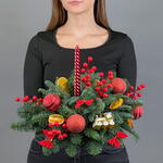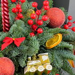 Живая новогодняя композиция в насыщенно-красной палитре с ягодами, шарами и золотыми свечами. Настоящая атмосфера рождественского тепла и уюта. Вызывает эффект “вау” — идеально подходит как подарок или праздничный декор.