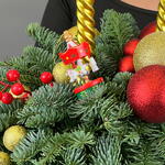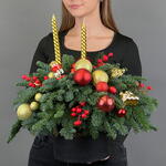 Эффектная композиция из пушистого нобилиса с золотыми свечами, крупными шарами и красными акцентами. Создаёт атмосферу тёплого, богатого новогоднего вечера.