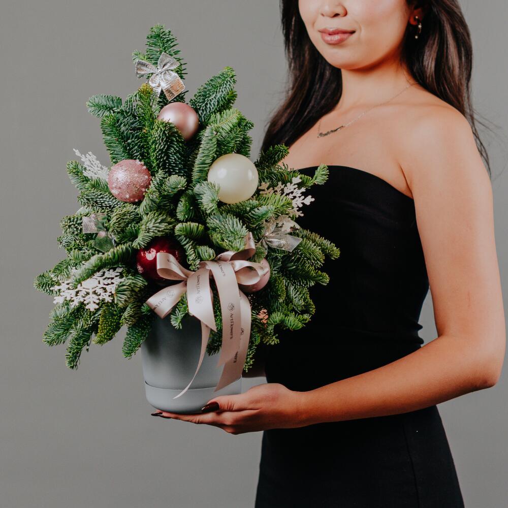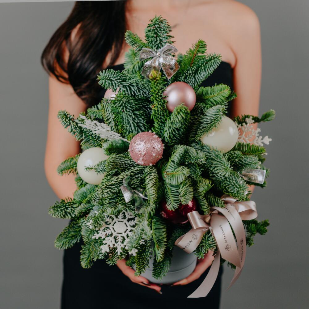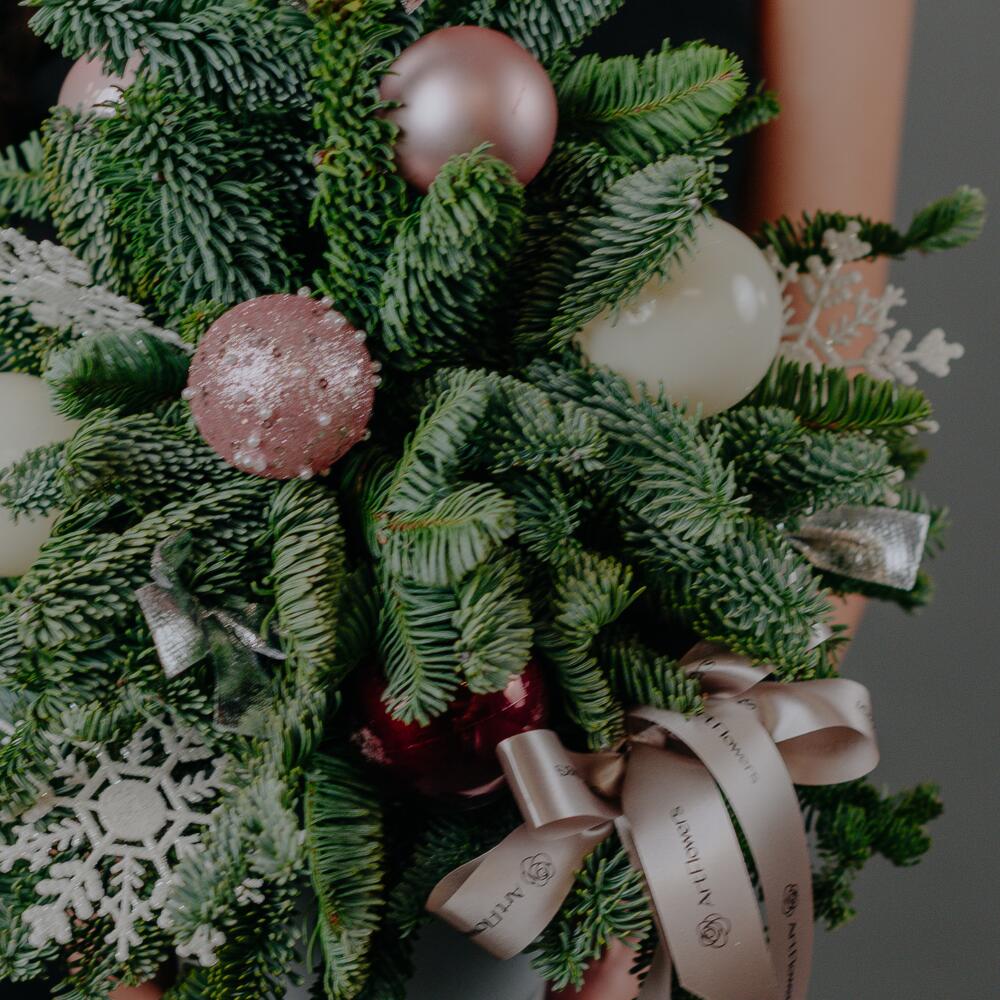 Бант - 5 шт. Нобилис - 2 шт. Горшок - 1 шт. шары средние - 10 шт. игрушка снежинка - 3 шт.