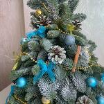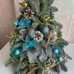Шикарная елочка из нобилиса в голубом и золотом украшении. Это роскошный подарок к Новому году коллегам, близким или друзьям.