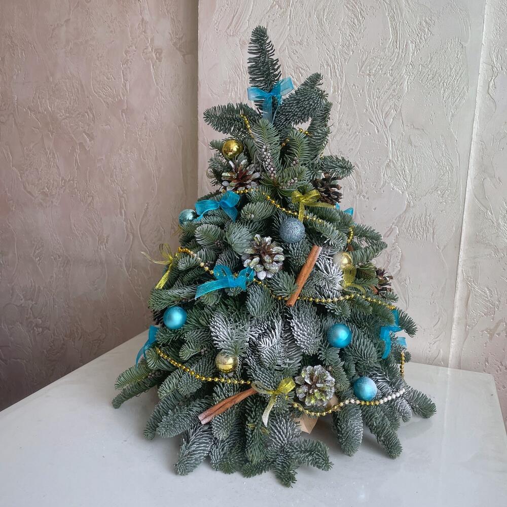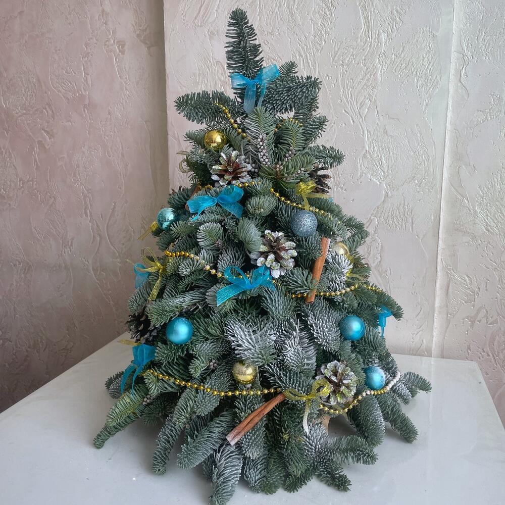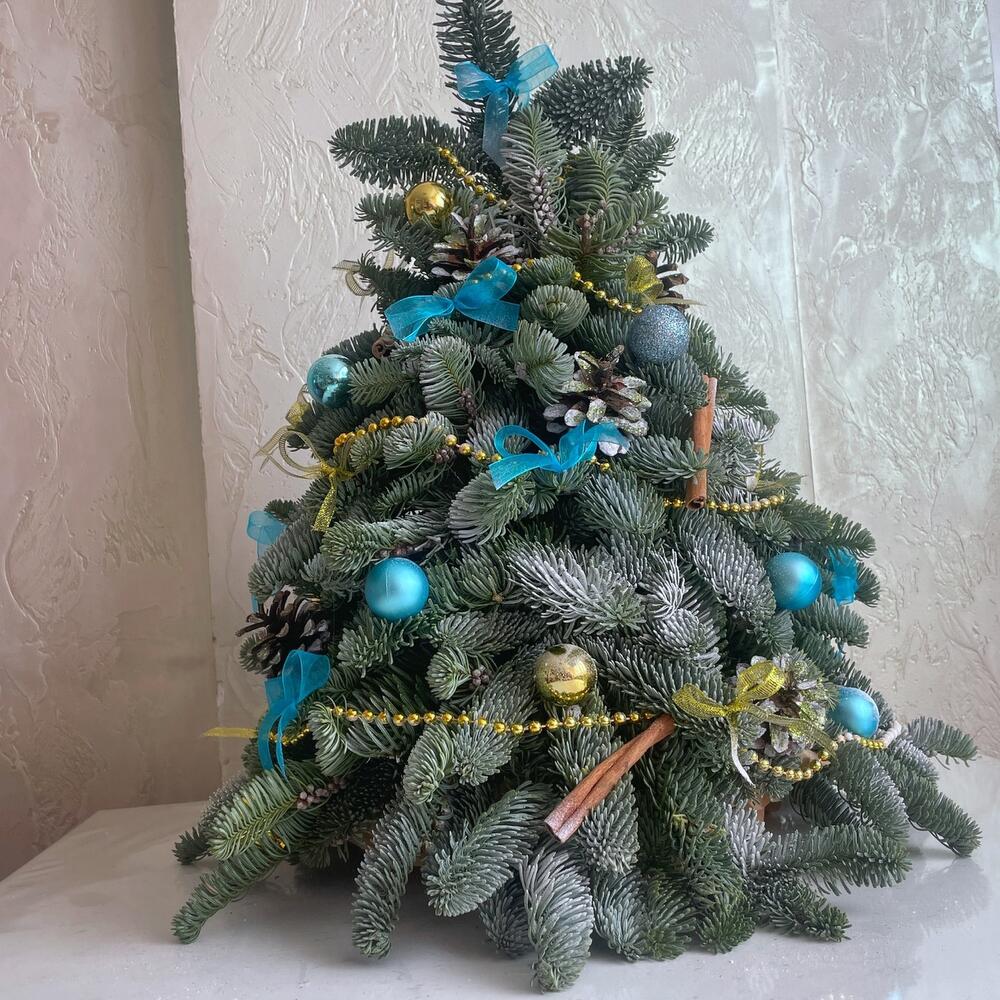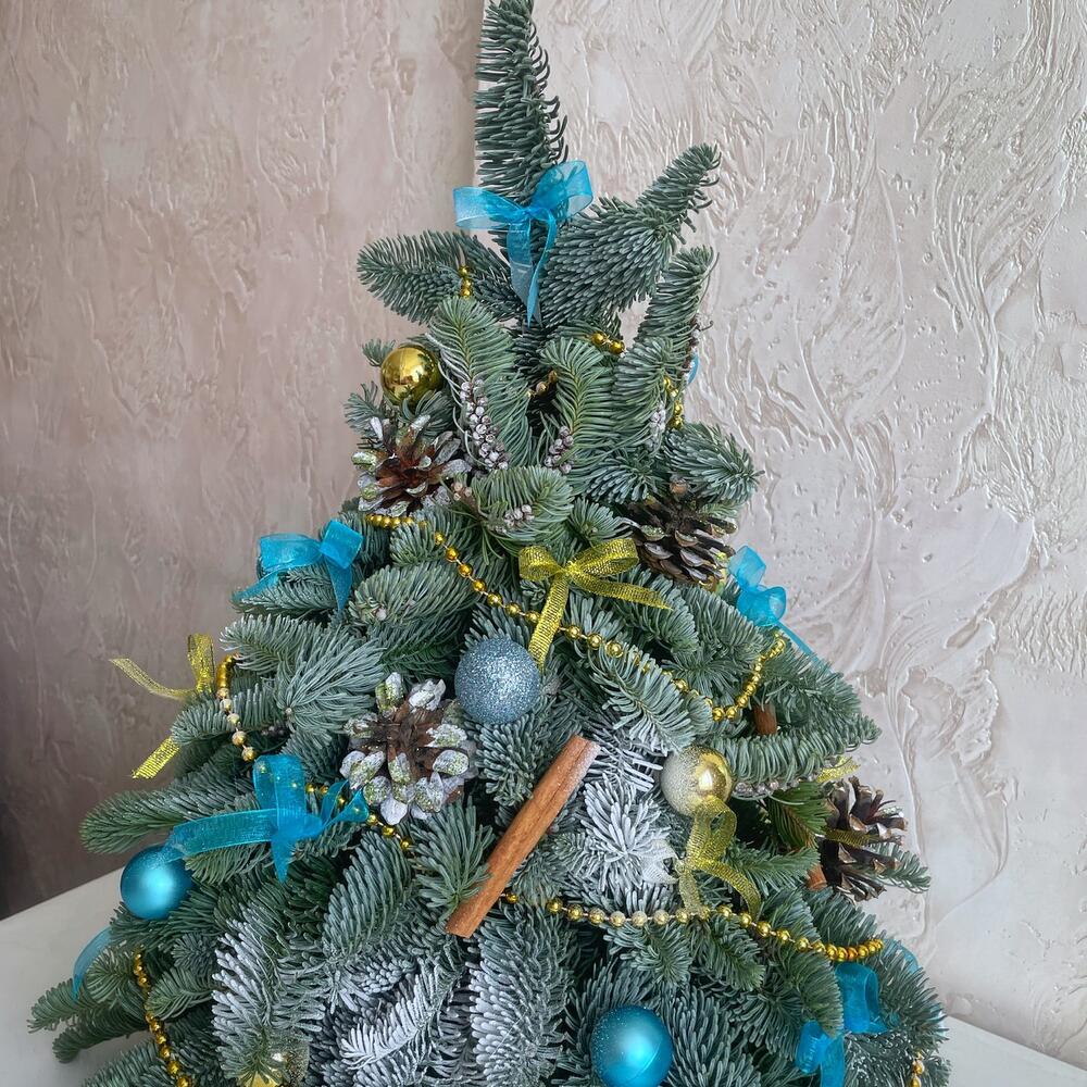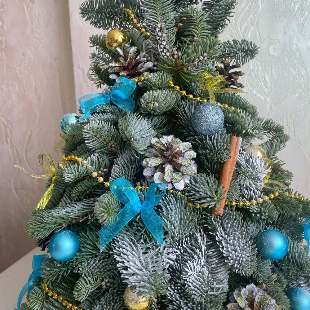 Шикарная елочка из нобилиса в голубом и золотом украшении. Это роскошный подарок к Новому году коллегам, близким или друзьям.