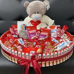 Открытка - 1 шт. Твикс - 10 шт. КитКат - 10 шт. Киндер шоколад - 80 шт. Киндер Делис - 10 шт. Риттер спорт - 3 шт. Чокопай - 12 шт. тедди плюшевые мишки - 1 шт. нестле плитка - 5 шт.