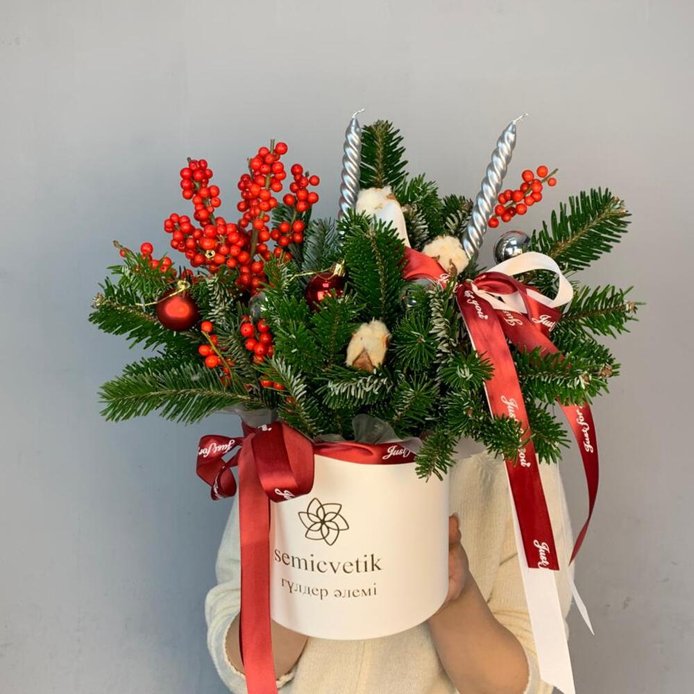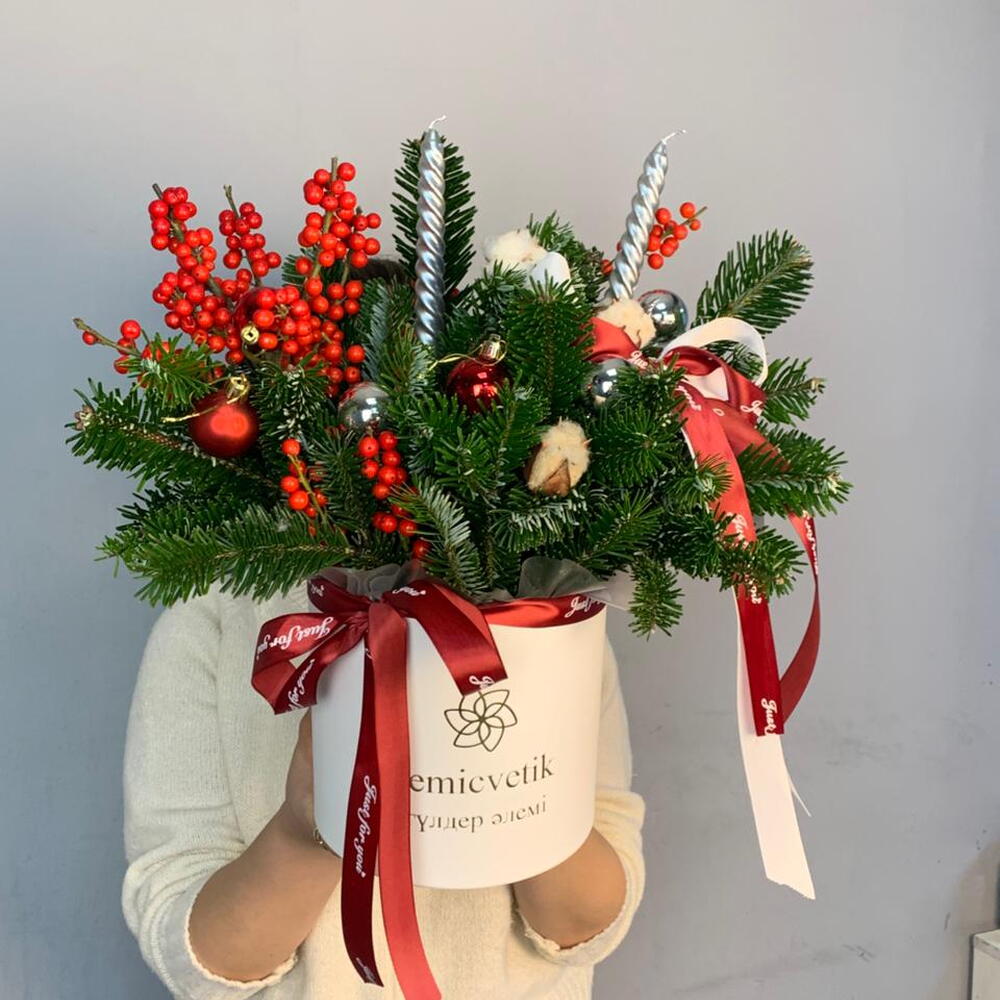 Илекс - 1 шт. Хлопок - 3 шт. Свеча - 2 шт. Флористическая губка - 2 шт. Нобилис - 2 шт. Шарик - 3 шт. Коробка белая - 1 шт. аква бумага полупрозрачная - 1 шт. лента репсовая красная и белая - 2 шт.