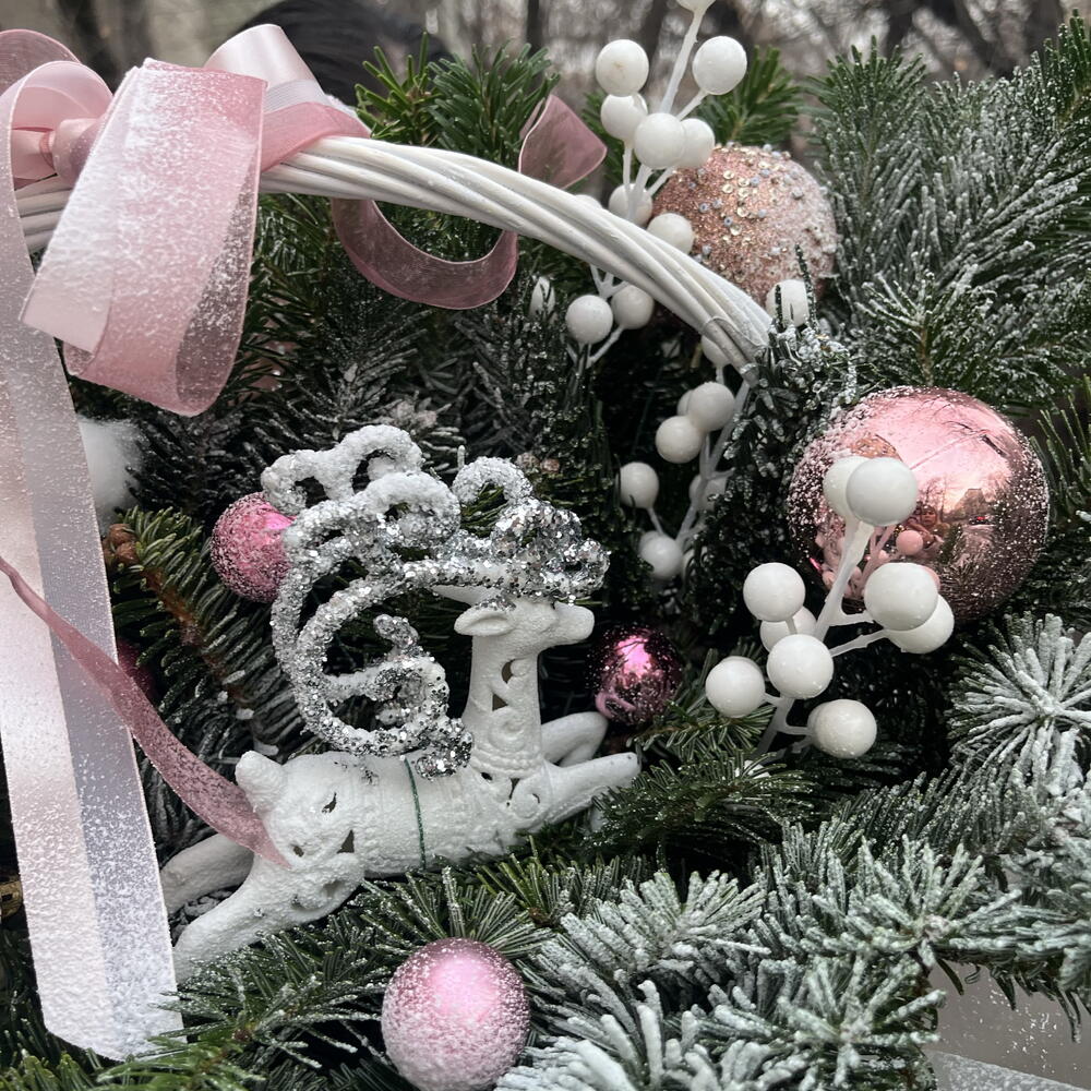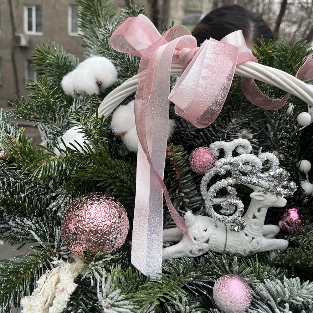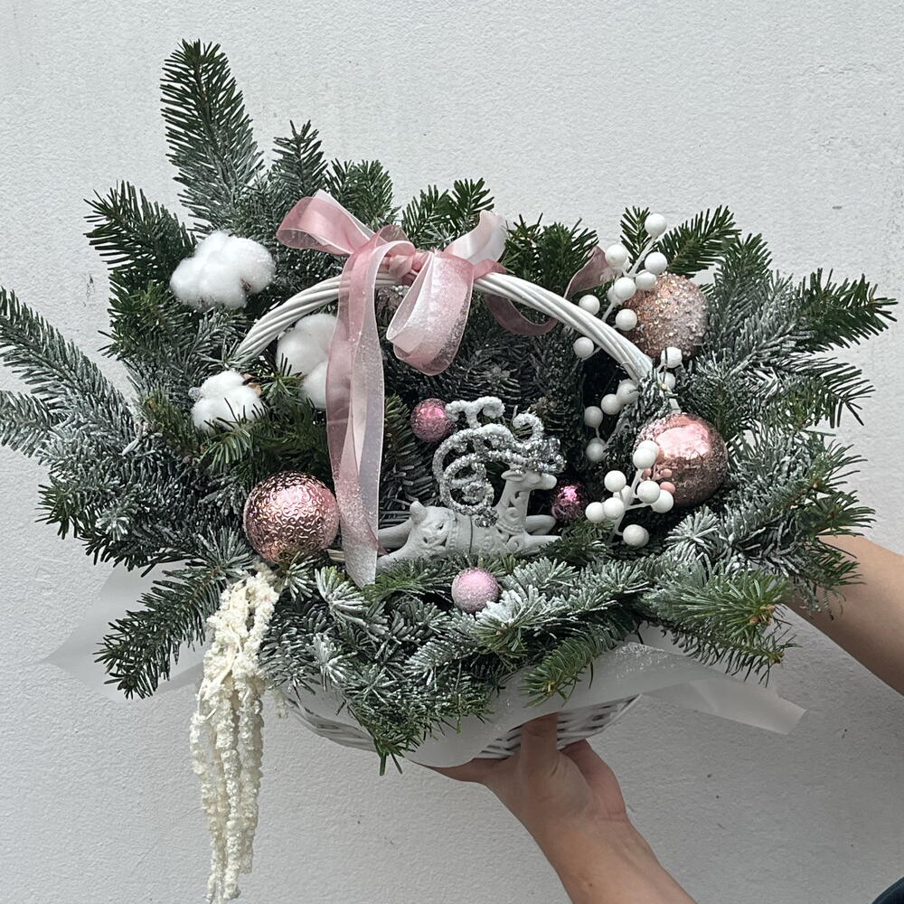Корзина - 1 шт. Хлопок - 3 шт. Амарант - 1 шт. Нобилис - 3 шт. Шары новогодние - 6 шт. ягоды - 3 шт. олень елочное украшение - 1 шт.