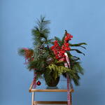 Праздничная новогодняя композиция в красной палитре, объединившая хвою, ягоды и яркие декоративные элементы. Яркий акцент для зимнего декора.