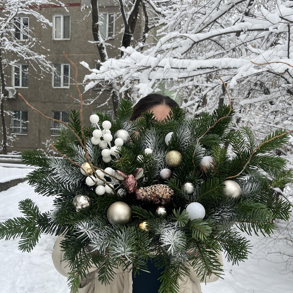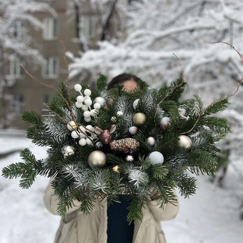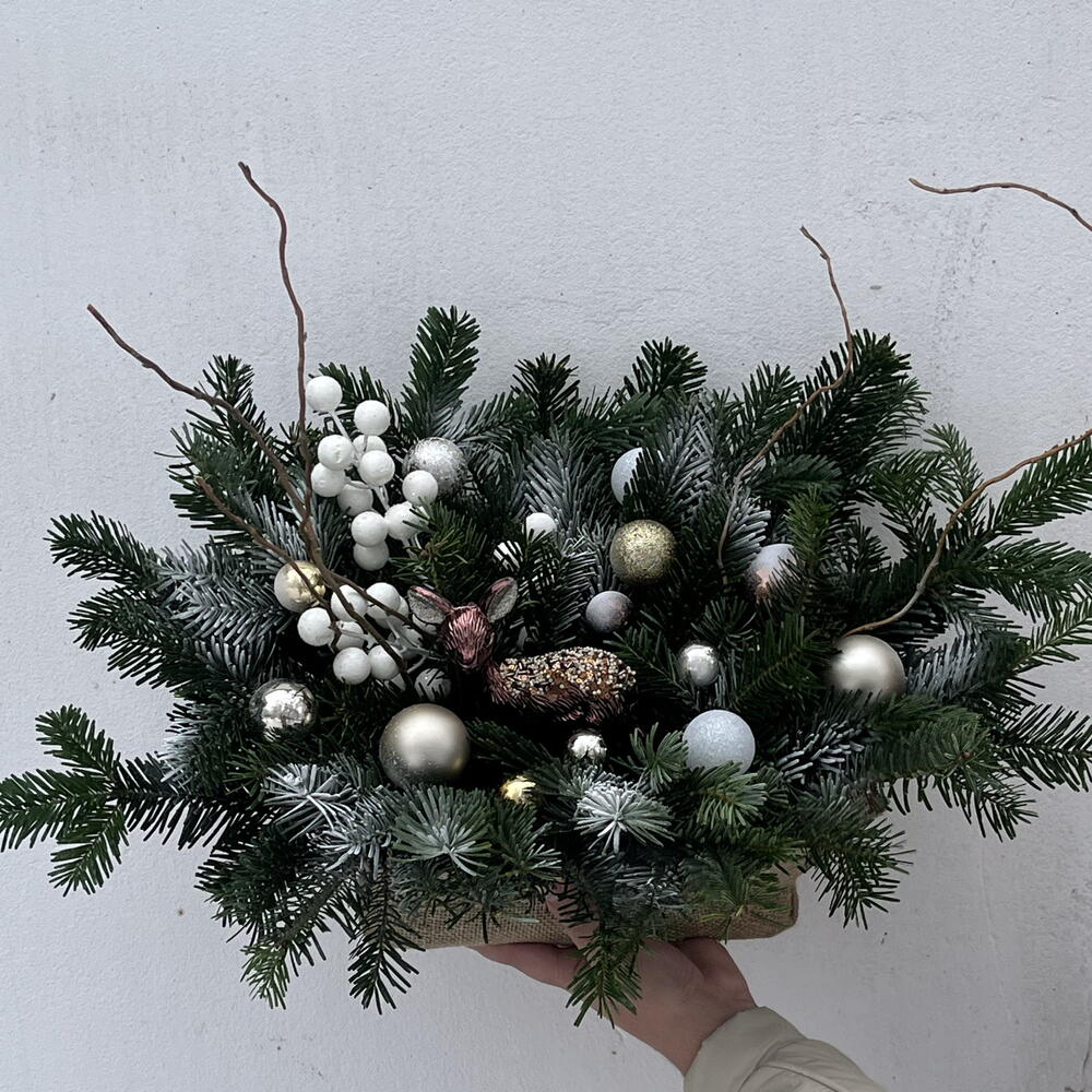 Композиция из живой ели , простоит больше месяца , нужно поливать .