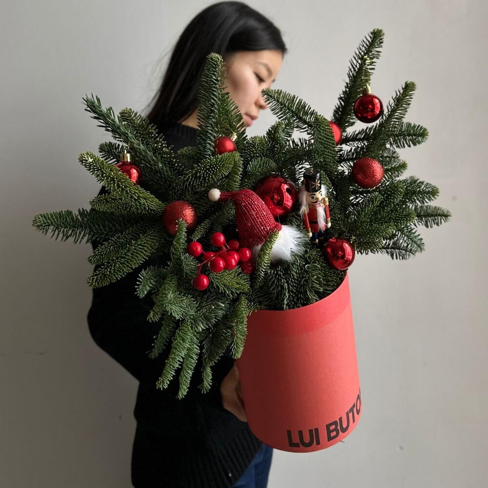 Композиция создаёт мягкую атмосферу праздника благодаря натуральной хвое и аккуратному оформлению