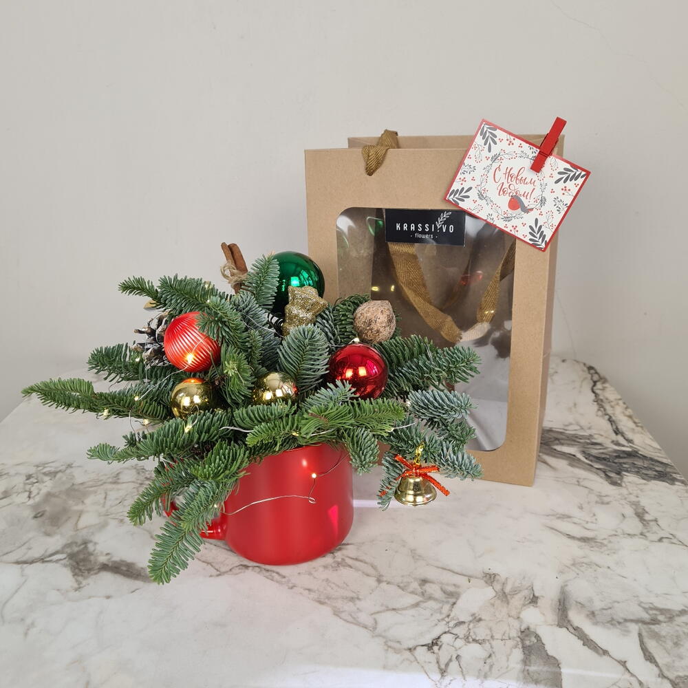 Оригинальный подарок на новый год. Композиция в кружке с натуральной ёлкой в стильном пакете.