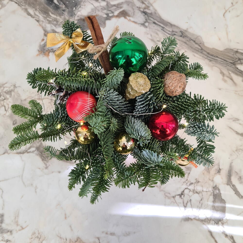 Открытка - 1 шт. Колокольчик - 1 шт. Пакет крафт - 1 шт. Оазис флористический - 1 шт. Гирлянда - 1 шт. Корица натуральная - 1 шт. бантик - 1 шт. шишка натуральна - 1 шт. ель нобилис ветка - 2 шт. игрушки ёлочные - 5 шт. орех натуральный - 1 шт. кружка керамика(в ассортименте ) - 1 шт.