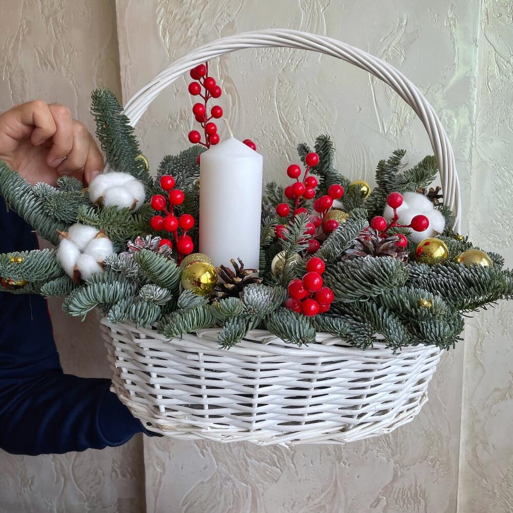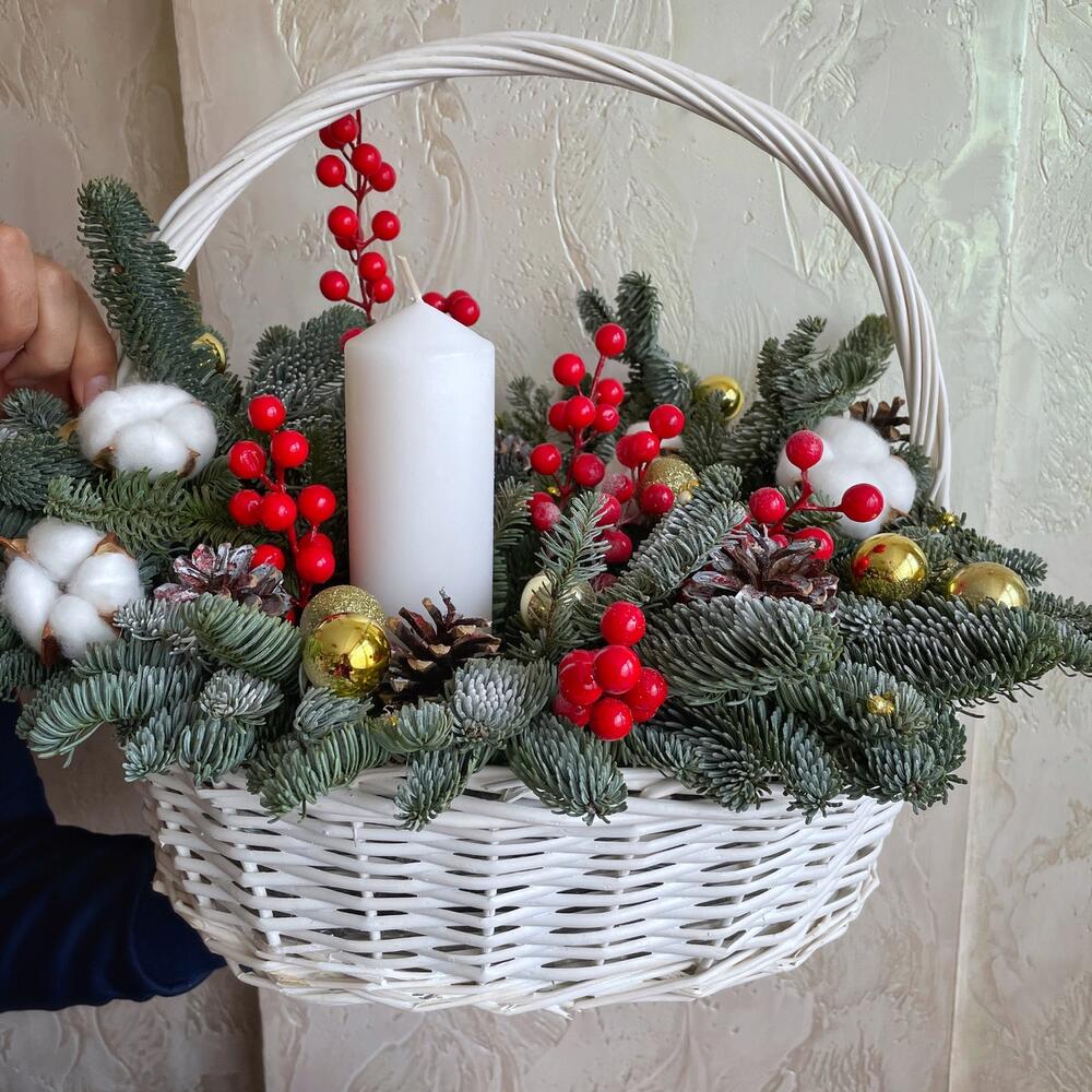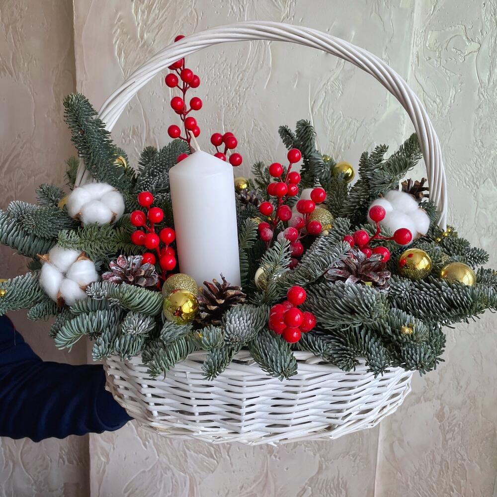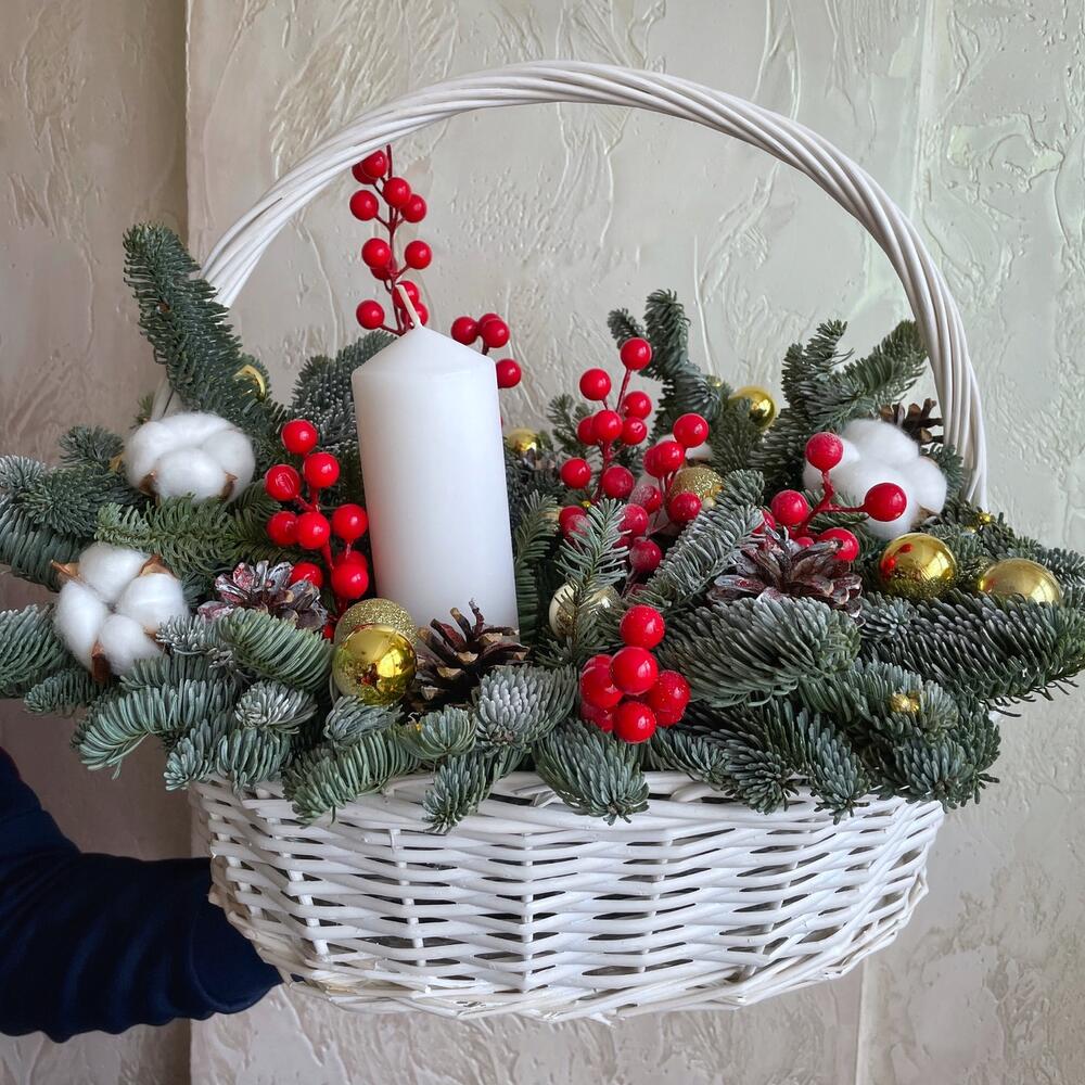 Подарочная корзина со свечой - отличный подарок к Новому году. Собранная из ароматной хвои она создаст ощущение праздника, подарит новогоднюю атмосферу. А горящая свеча обеспечит ощущение уюта и тепла.