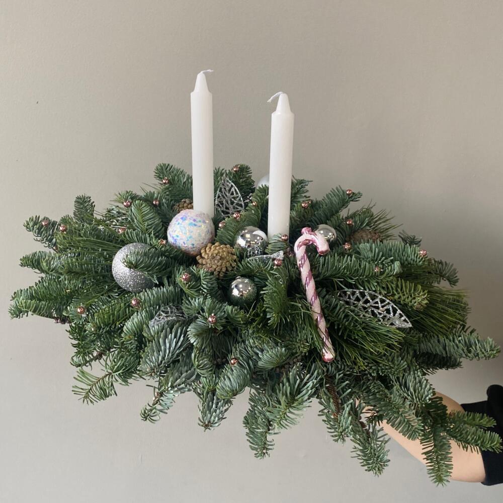 Шары - 4 шт. Поддон - 1 шт. Нобилис - 1 шт. Ветка - 1 шт. свечи - 2 шт. карамелька - 1 шт.