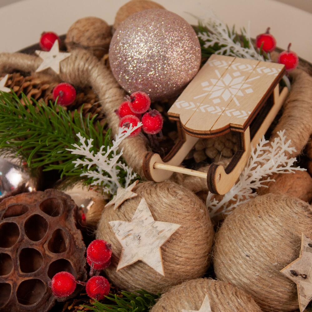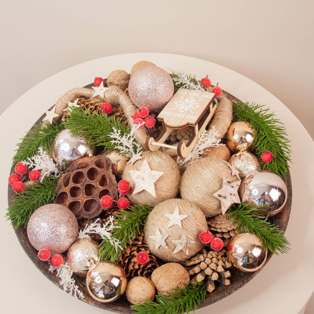 Шишки Ягоды засахаренные Ветки искусственные Тарелка Сани деревянные Елка искуственная Шарики пластиковые Коробка лотоса