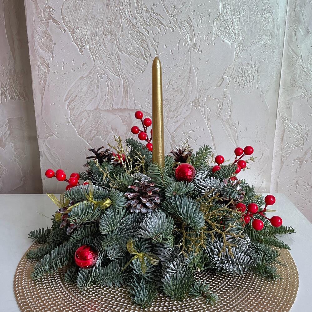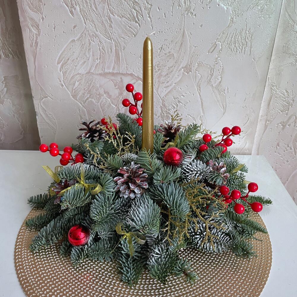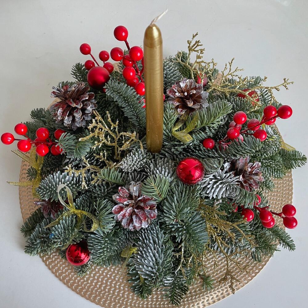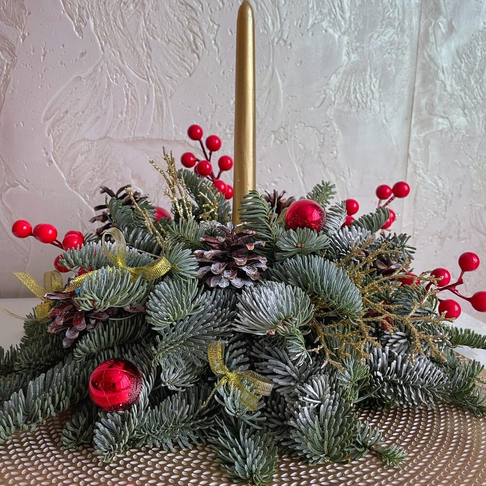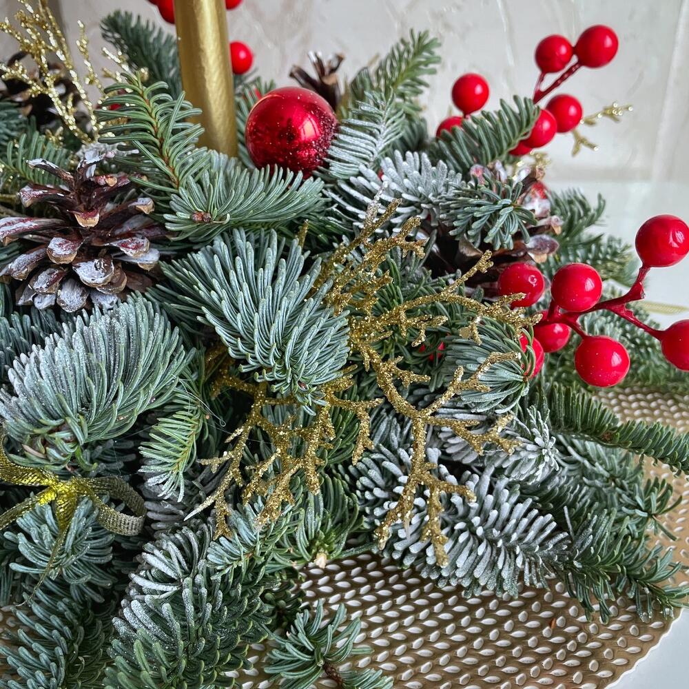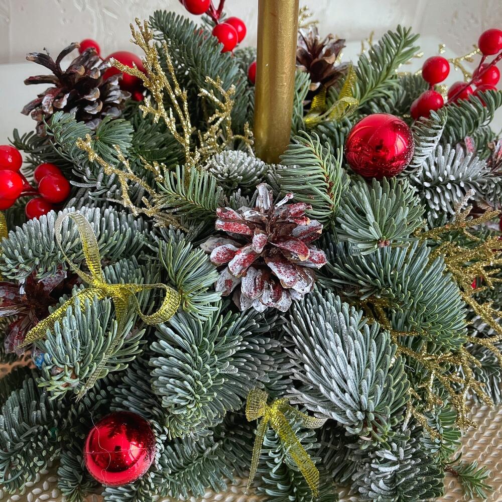 Шишки Новогодние игрушки Нобилис Ягодки красные Свеча золотая Ветка золотая Бантики парчовые
