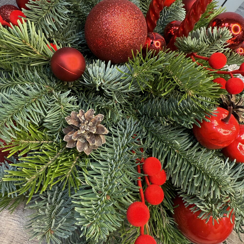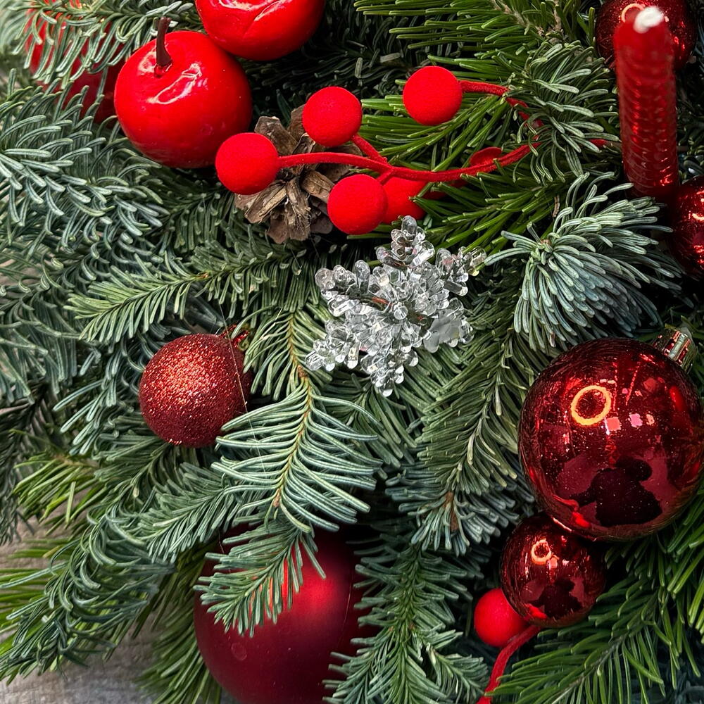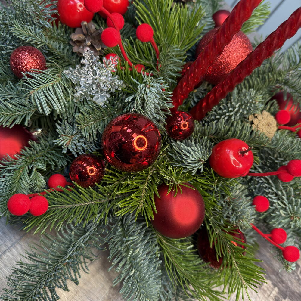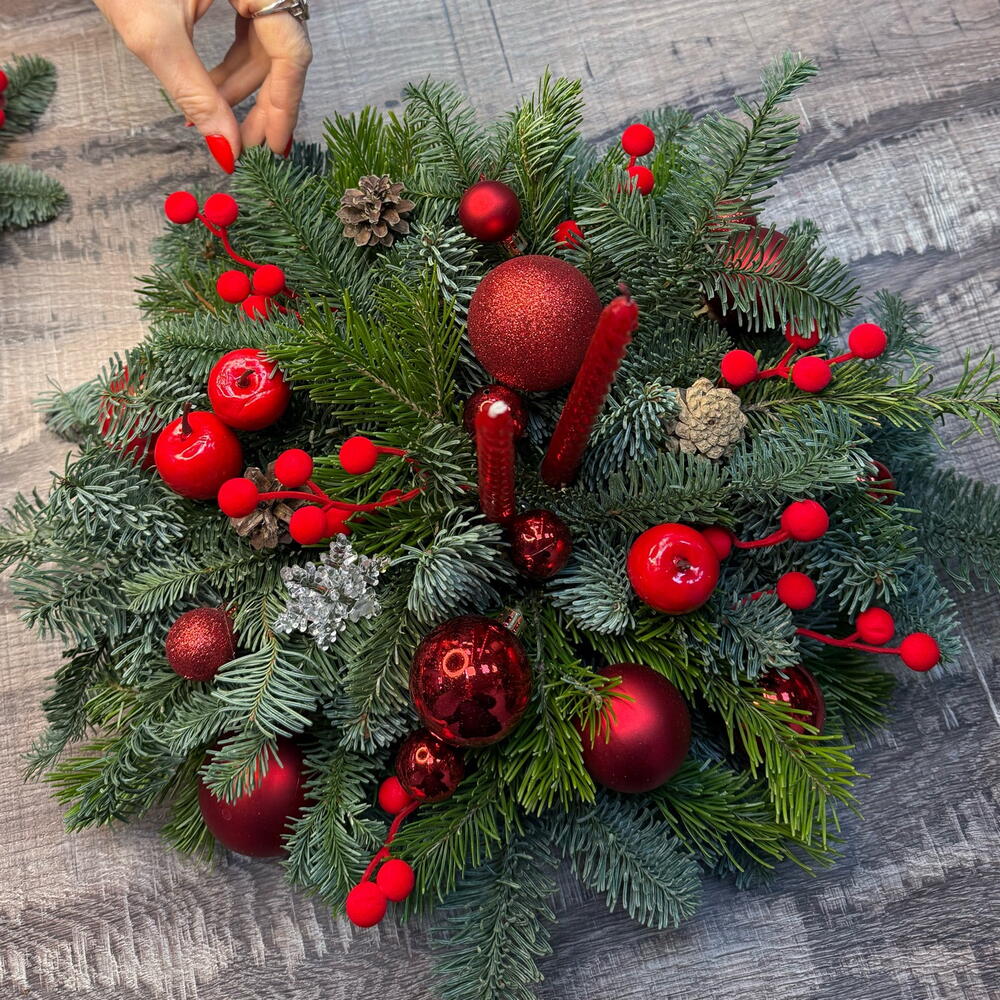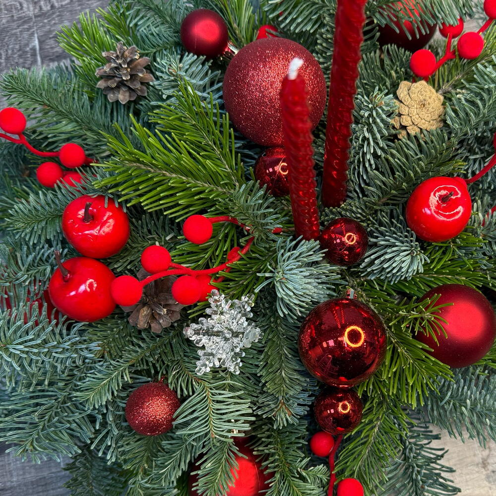 Свеча - 1 шт. Оазис - 1 шт. Нобилис - 3 шт. Елочные игрушки - 15 шт. Пихта живая - 3 шт. поддон пластиковый - 1 шт. Шишка Ели - 5 шт.