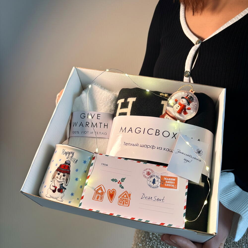 Открыточка с вашими пожеланиями - 1 шт. новогодняя кружка - 1 шт. теплые носочки - 1 шт. теплый шарф - 1 шт.