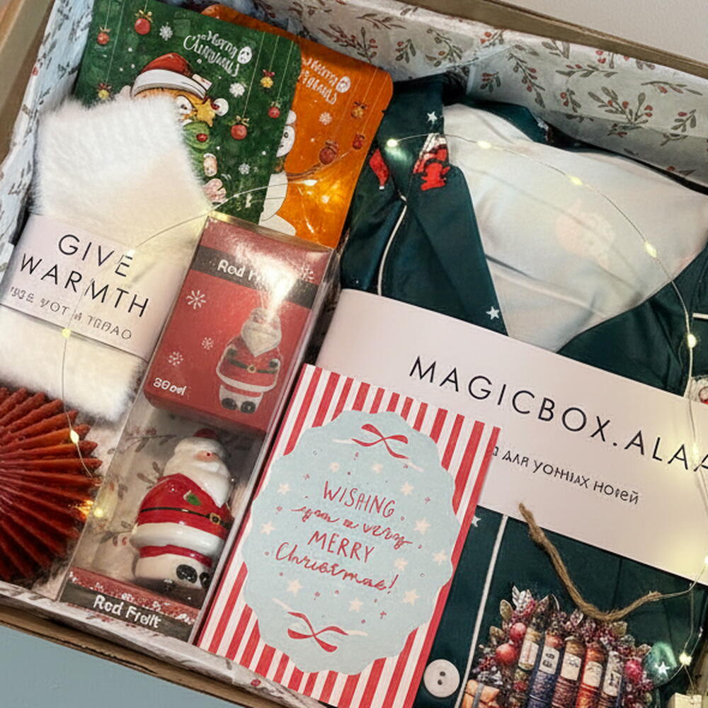 Открытка - 1 шт. Свеча новогодняя - 1 шт. Маска для лица - 2 шт. диффузор - 1 шт. пижама - 1 шт. теплые носочки стандартного размера - 1 шт.