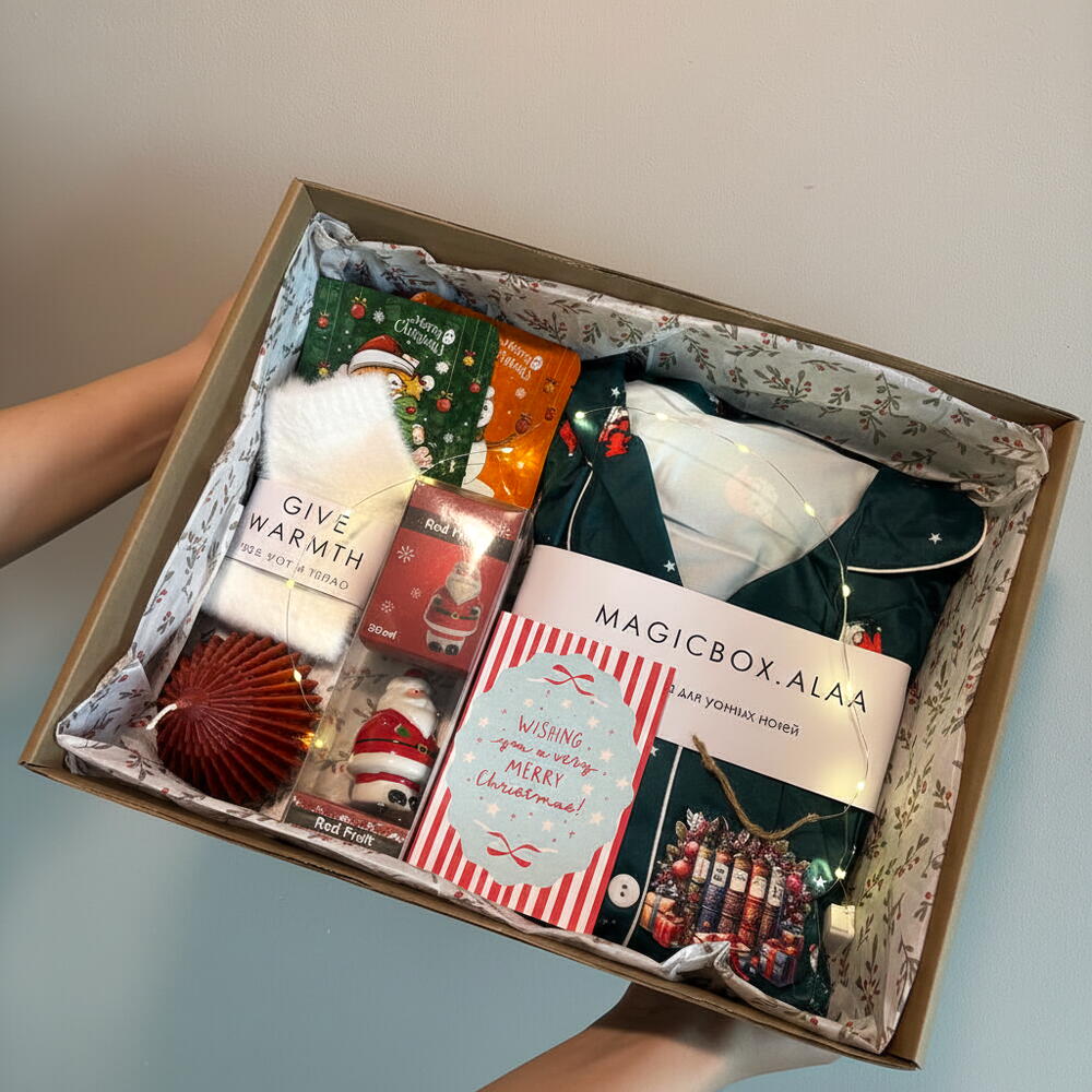 Создайте атмосферу праздника с этим изысканным новогодним подарочным набором. В него входит стильная открытка для поздравительных слов, уютная новогодняя свеча, придающая атмосфере тепло и светлую волшебную ноту. Добавьте в эту смесь немного релакса и ухода за собой с двумя масками для лица. Насладитесь ароматом, исходящим от диффузора, он поможет создать особый стиль и незабываемую атмосферу. Удобная пижама и невероятно теплые носочки делают этот набор идеальным подарком для тех, кто ценит уют и комфорт. Удивите своих близких и друзей этим исключительным подарком!