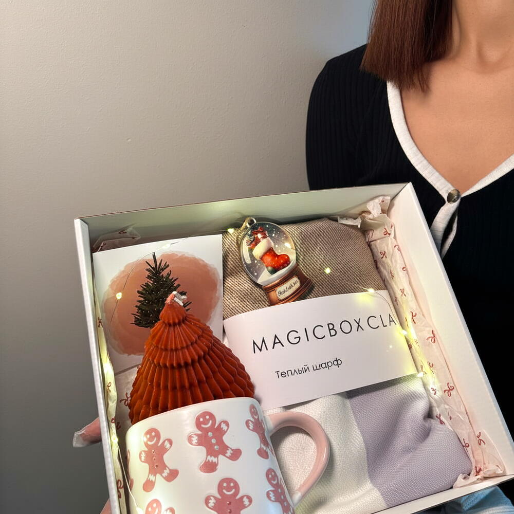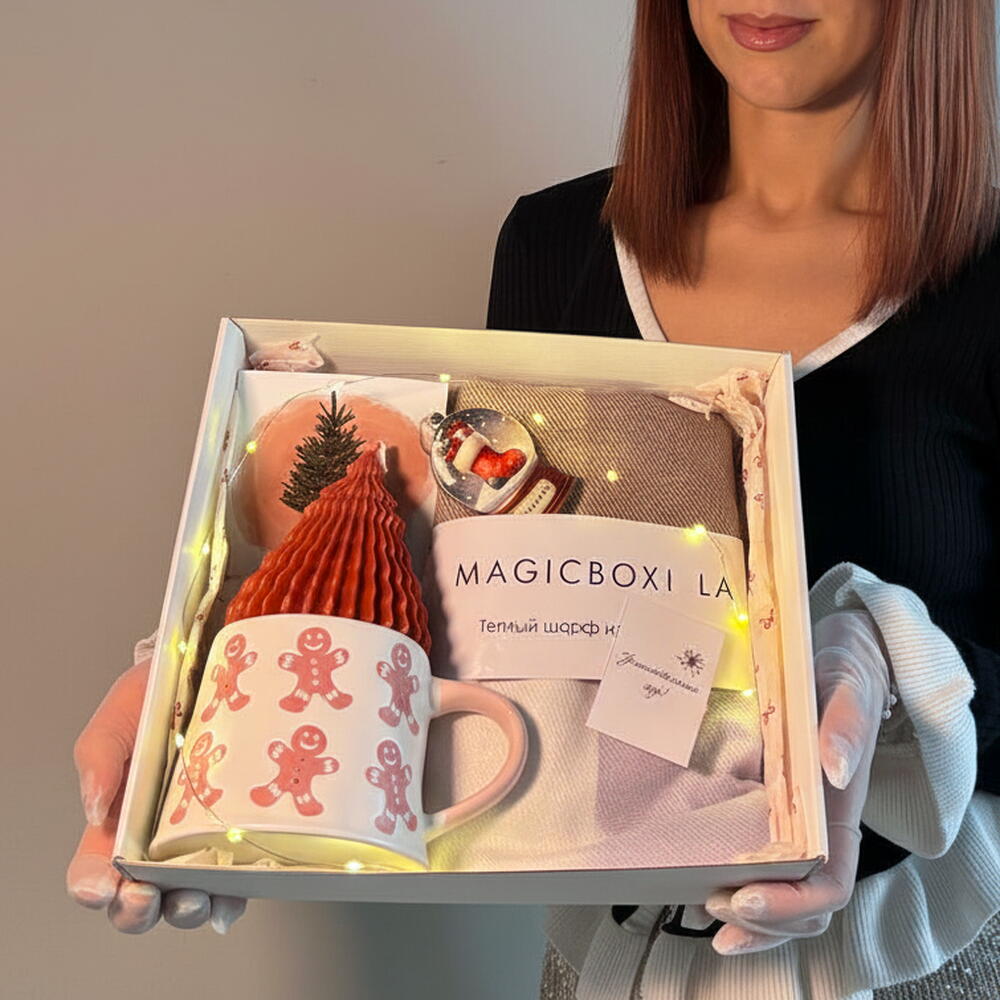 Открыточка с вашими пожеланиями - 1 шт. арома свеча - 1 шт. новогодняя кружка - 1 шт. теплый шарф - 1 шт.