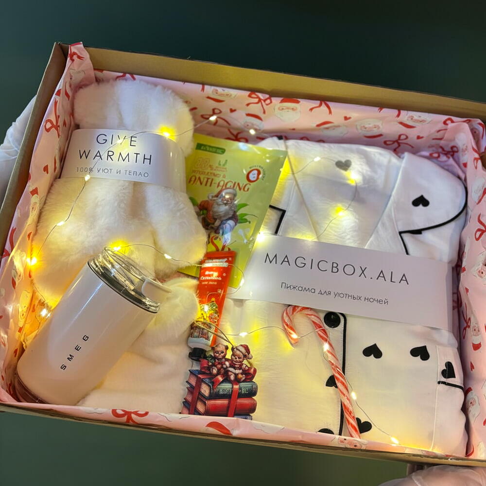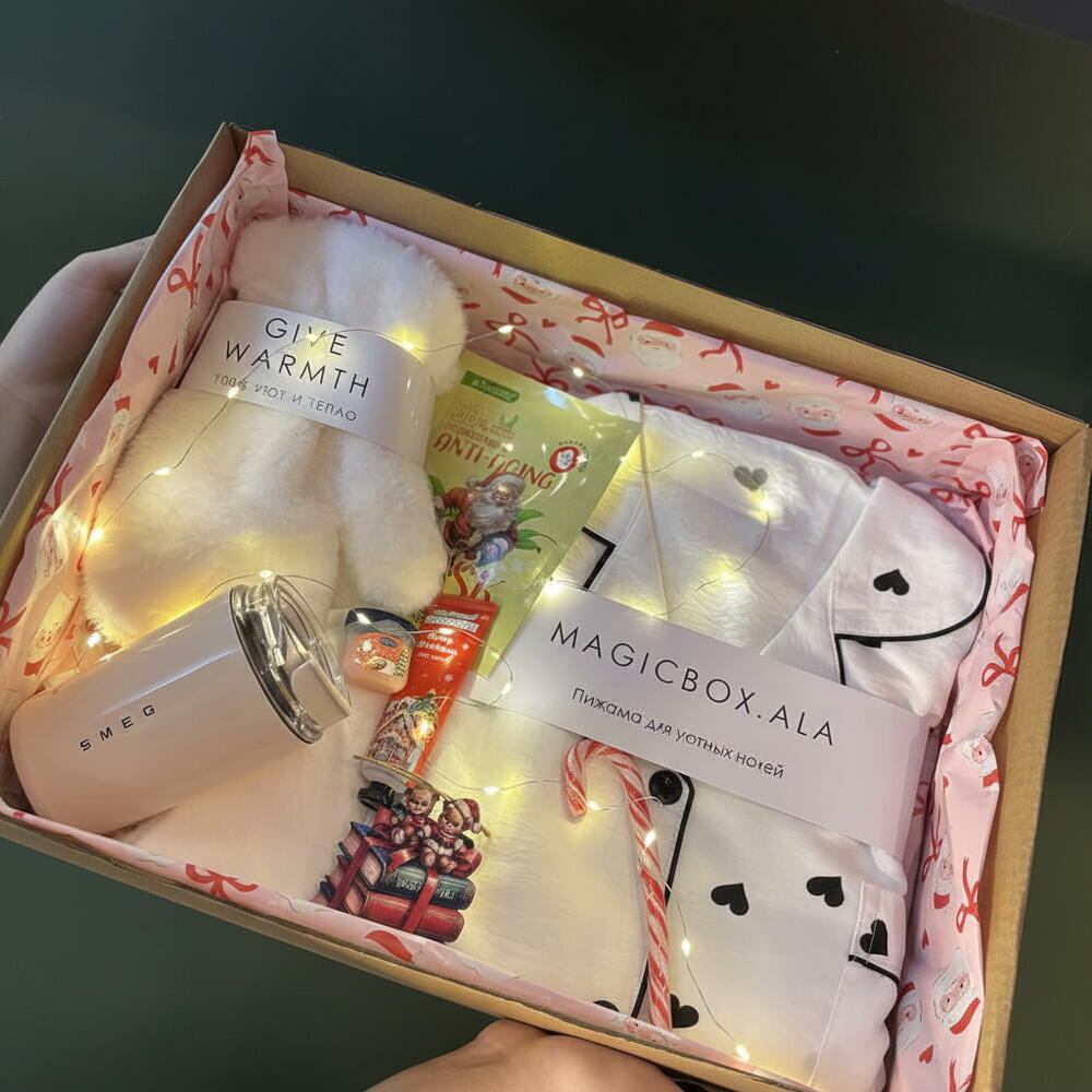 Открыточка с вашими пожеланиями - 1 шт. Крем для рук - 1 шт. Варежки - 1 шт. Маска для лица - 1 шт. термокружка - 1 шт. пижама - 1 шт. бальзам для губ sadoer - 1 шт.