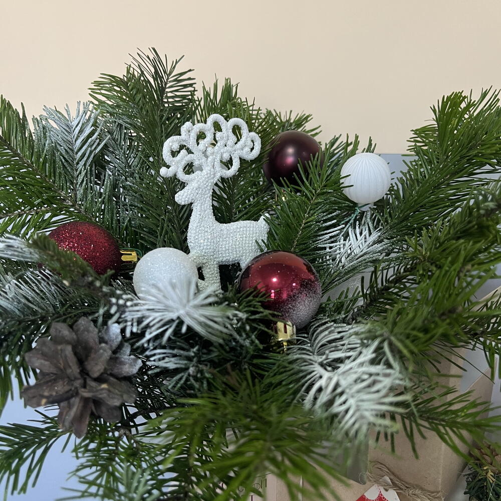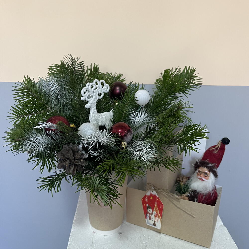 Елочная композиция из живой ели с невероятным ароматом . Простоит больше месяца , нужно поливать .
