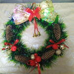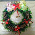 Настенное украшение Новогодний венок с подсветкой из светодиодной гирлянды в виде большого золотистого банта. Сочетание природных материалов шишек и ёлочных игрушек делает венок ярким праздничным элементом декора помещения.