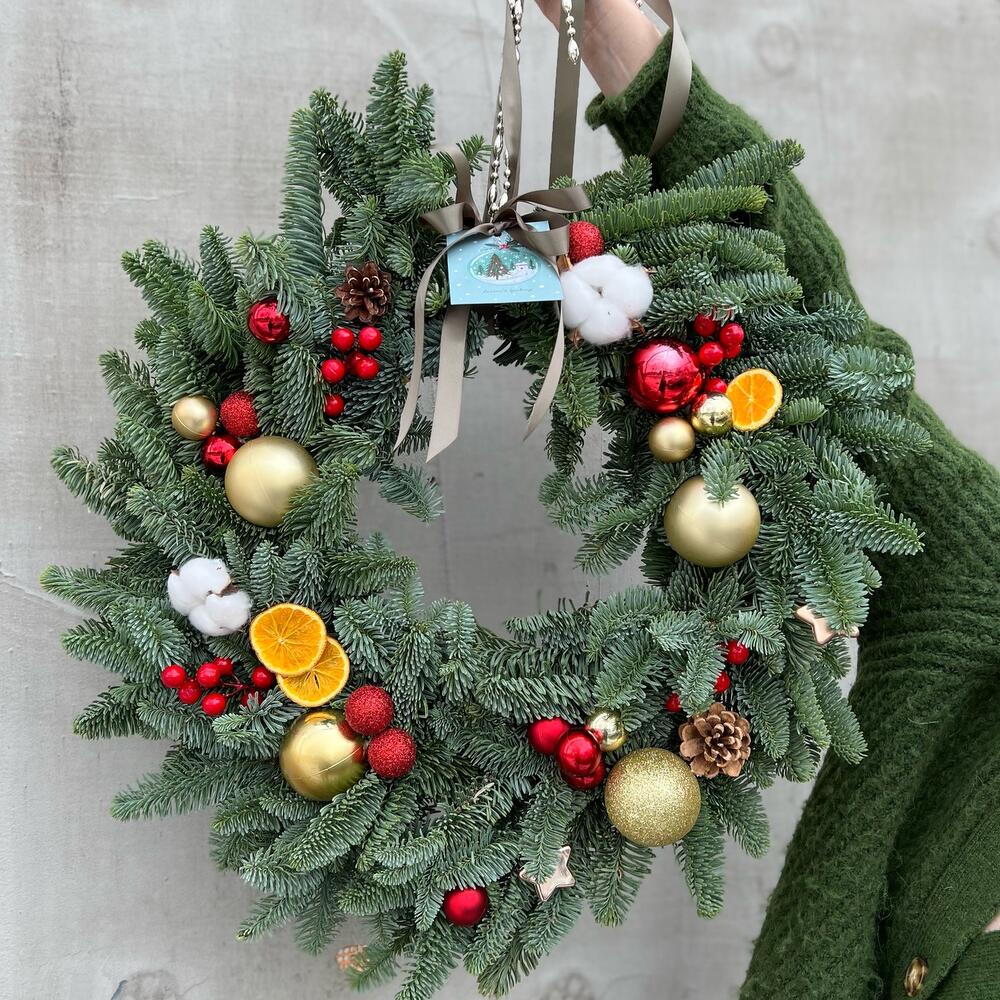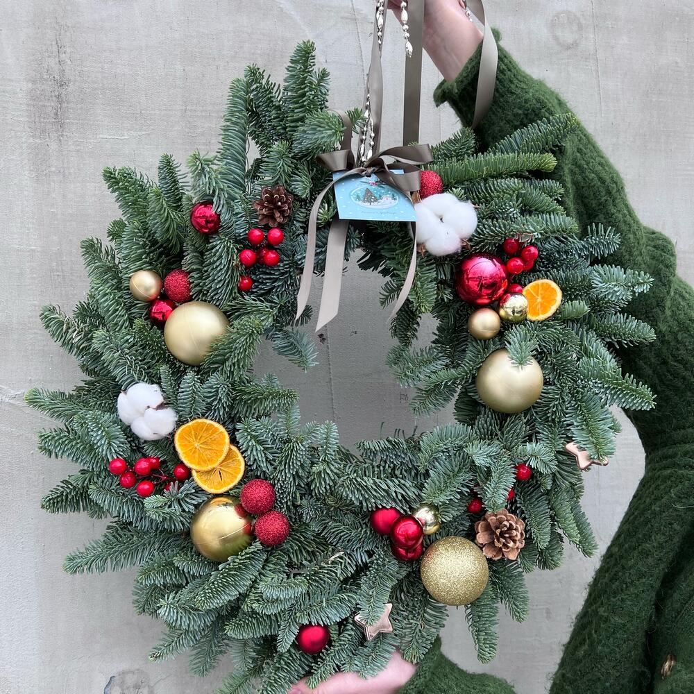 Новогодний венок из натуральной ели, цвет игрушек по согласованию