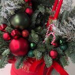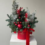 Ягоды декоративные - 1 шт. Нобилис - 2 шт. Елочные игрушки - 15 шт. Можжевельник - 2 шт. Коробка брендированная - 1 шт. Лента бархат - 1 шт. леденец декоративный - 2 шт. свечи немецкие - 2 шт.