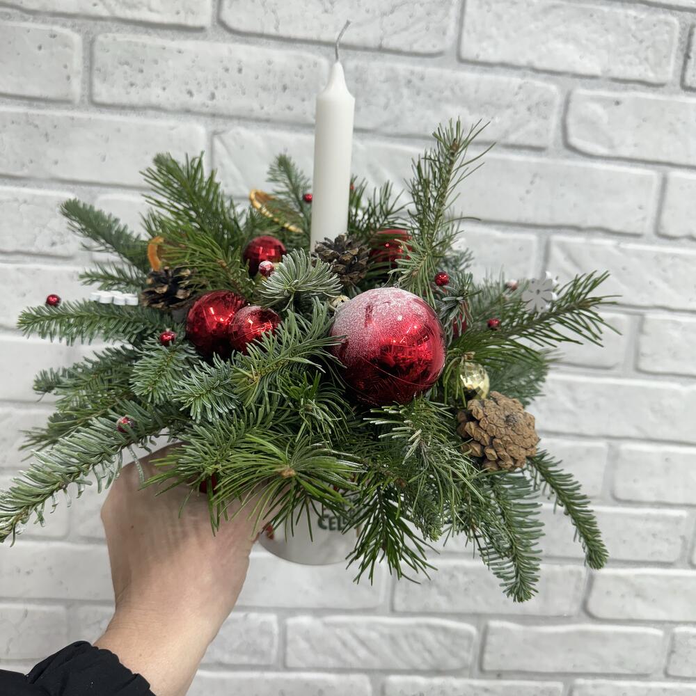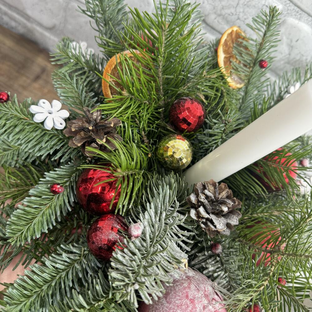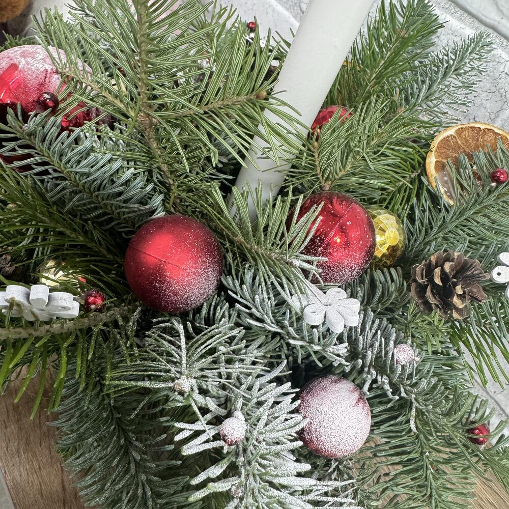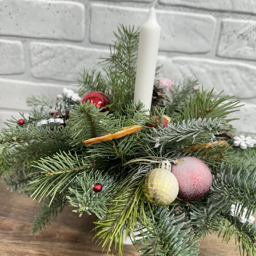 Свеча - 1 шт. Нобилис - 2 шт. Игрушки елочные - 7 шт. Оазис флористический - 1 шт. Пихта живая - 2 шт. апельсиновые дольки - 4 шт. кружка керамика - 1 шт.