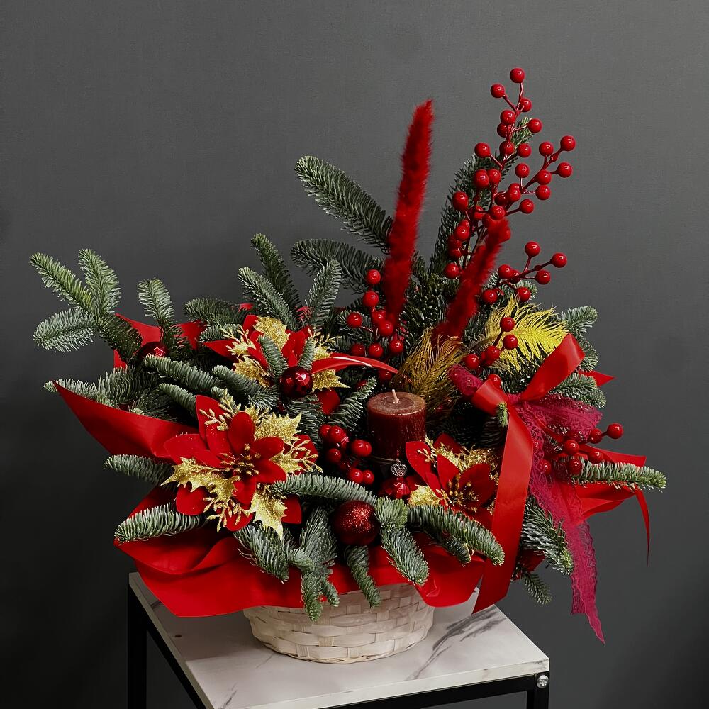 Корзина плетеная - 1 шт. Елка натуральная - 2 шт. декаротивные ягоды - 3 шт. декоративные новогодние игрушки - 7 шт.