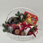 Киви - 5 шт. Яблоко - 2 шт. Корзина плетеная - 1 шт. ферреро роше - 125 гр. Нобилис - 2 шт. Елочные игрушки - 3 шт. Печенье в жестяной банке - 340 гр. раффаэлло 150 гр - 1 шт. гранат красный - 1 шт. minis mix конфеты - 162 гр.