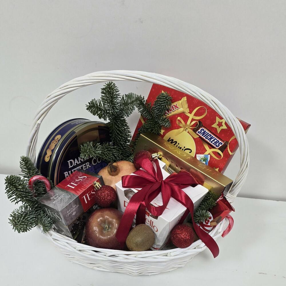 Киви - 5 шт. Яблоко - 2 шт. Корзина плетеная - 1 шт. ферреро роше - 125 гр. Нобилис - 2 шт. Елочные игрушки - 3 шт. Печенье в жестяной банке - 340 гр. раффаэлло 150 гр - 1 шт. гранат красный - 1 шт. minis mix конфеты - 162 гр.