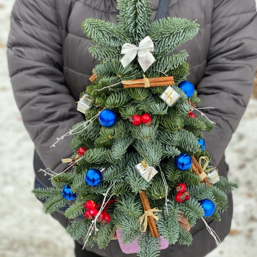 Новогодняя елочка ручной работы из голландского нобилиса, украшенная новогодним декором.