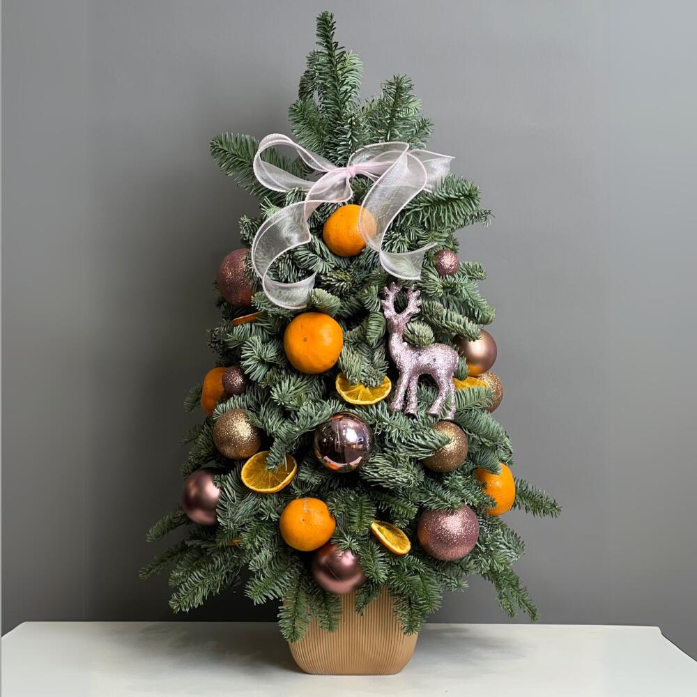 Кашпо - 1 шт. Оазис - 2 шт. Бант - 1 шт. Шары - 30 шт. Нобилис - 6 шт. Олень - 1 шт. мандарины - 10 шт. сухофрукт мандарин - 10 шт.